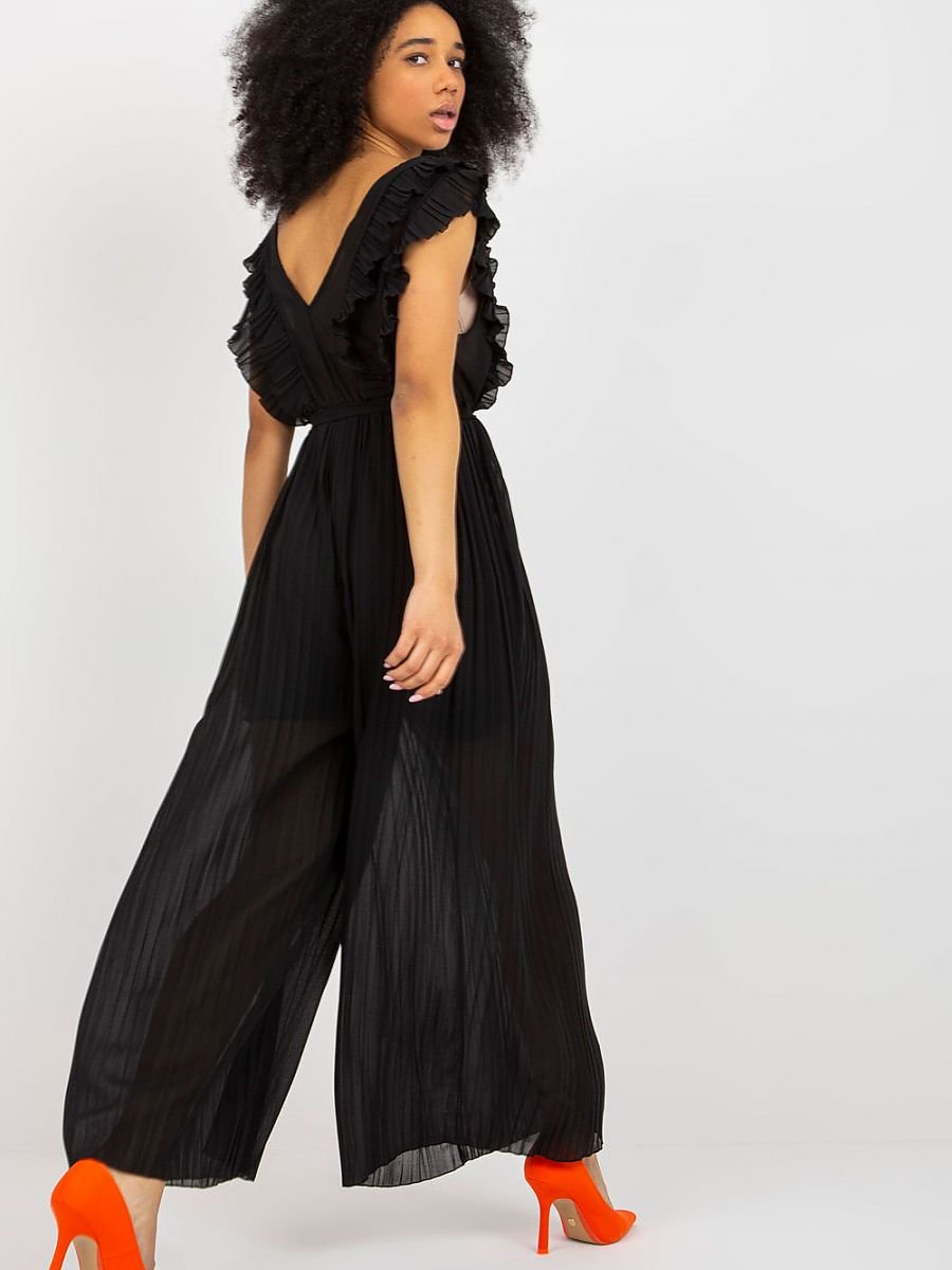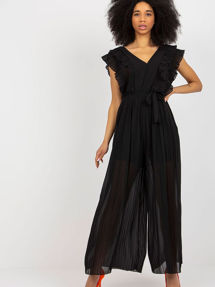 Plisowany kombinezon z szerokimi nogawkami, dekoltem w serek oraz wiązaniem w pasie. Kombinezon posiada podszewkę.