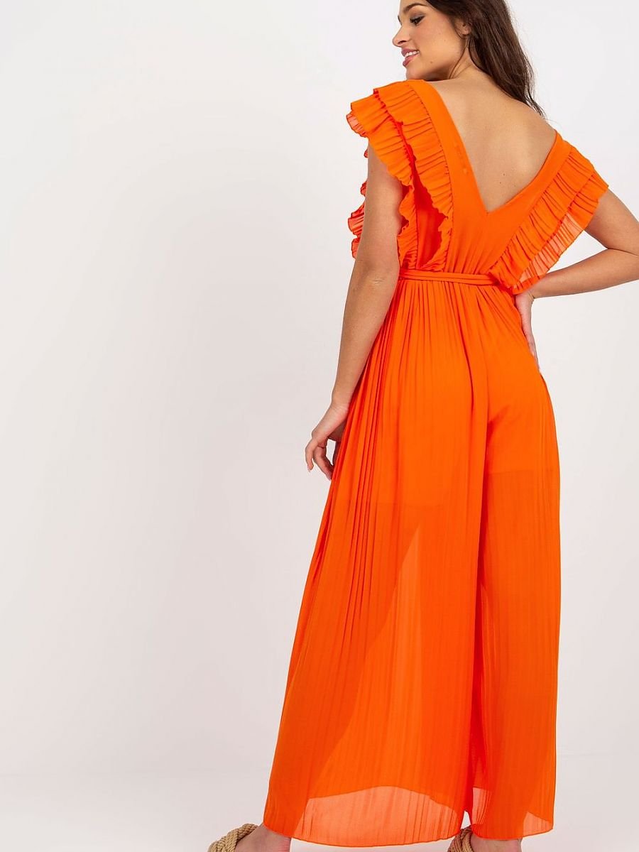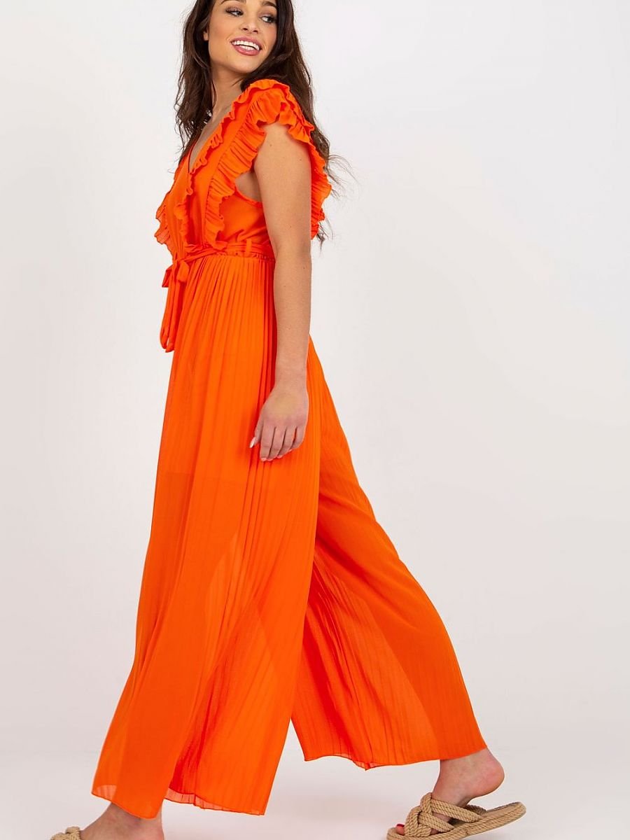 Plisowany kombinezon z szerokimi nogawkami, dekoltem w serek oraz wiązaniem w pasie. Kombinezon posiada podszewkę.