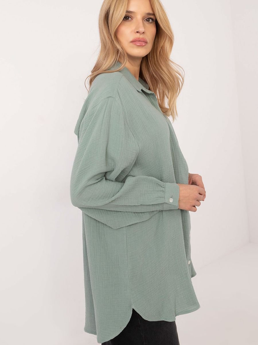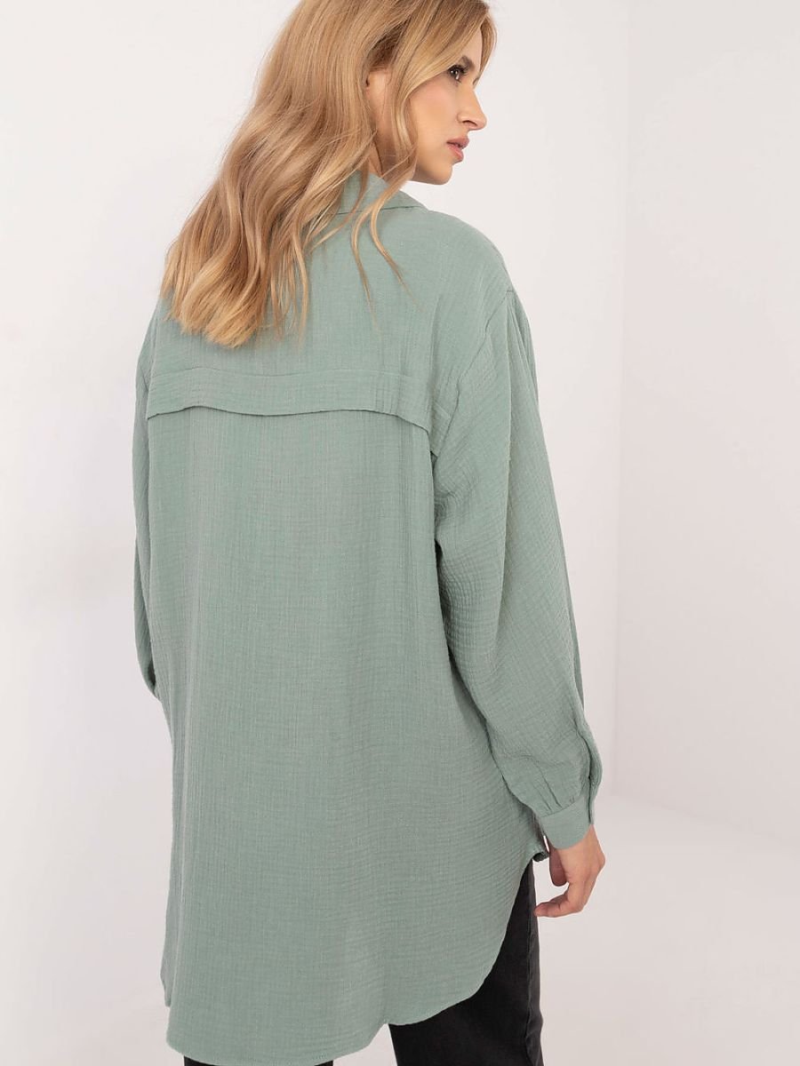 Casualowa koszula damska o wyjątkowej, urozmaiconej fakturze materiału, wykonana z ekologicznej bawełny, idealna na co dzień. Dłuższy fason i bufiaste rękawy nadają jej modnego, lekko romantycznego charakteru. Koszula posiada klasyczny kołnierzyk oraz zapięcie na guziki, co podkreśla jej uniwersalny styl, a długi rękaw z delikatnym bufiastym akcentem dodaje jej subtelnej elegancji. To wygodna, a zarazem stylowa propozycja, która sprawdzi się w wielu casualowych stylizacjach, dbając zarówno o modny wygląd, jak i komfort noszenia.