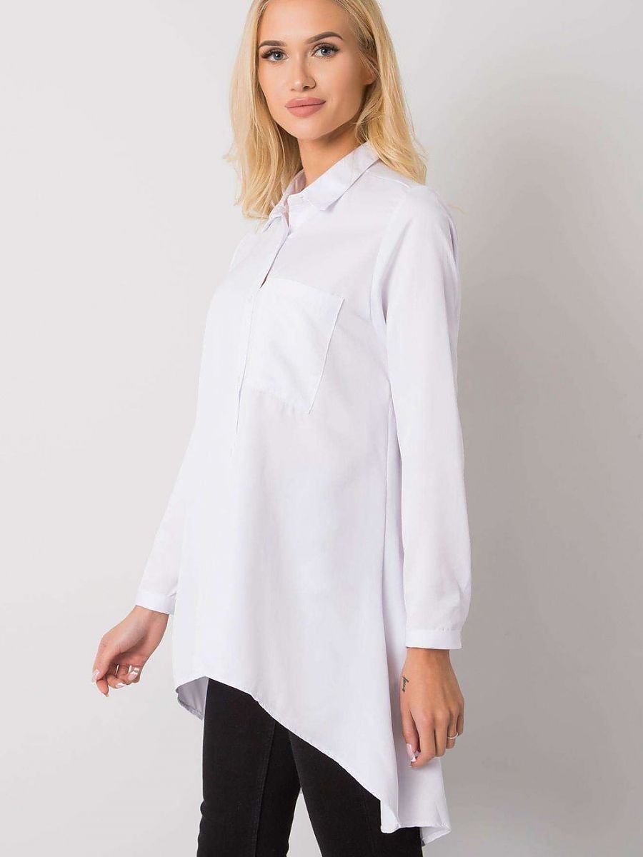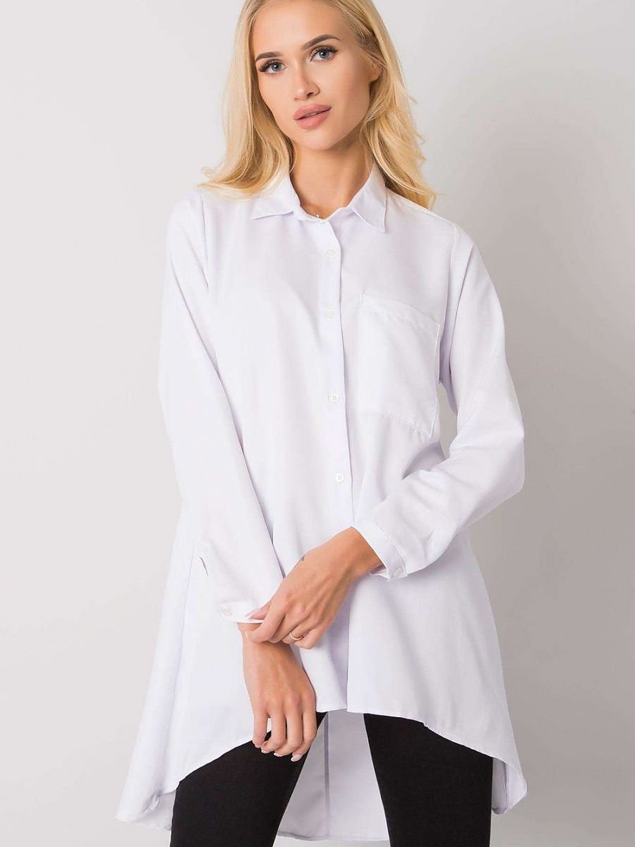 Biała koszula z dłuższym tyłem zapinana na guziki. Idealna na wiele okazji.
