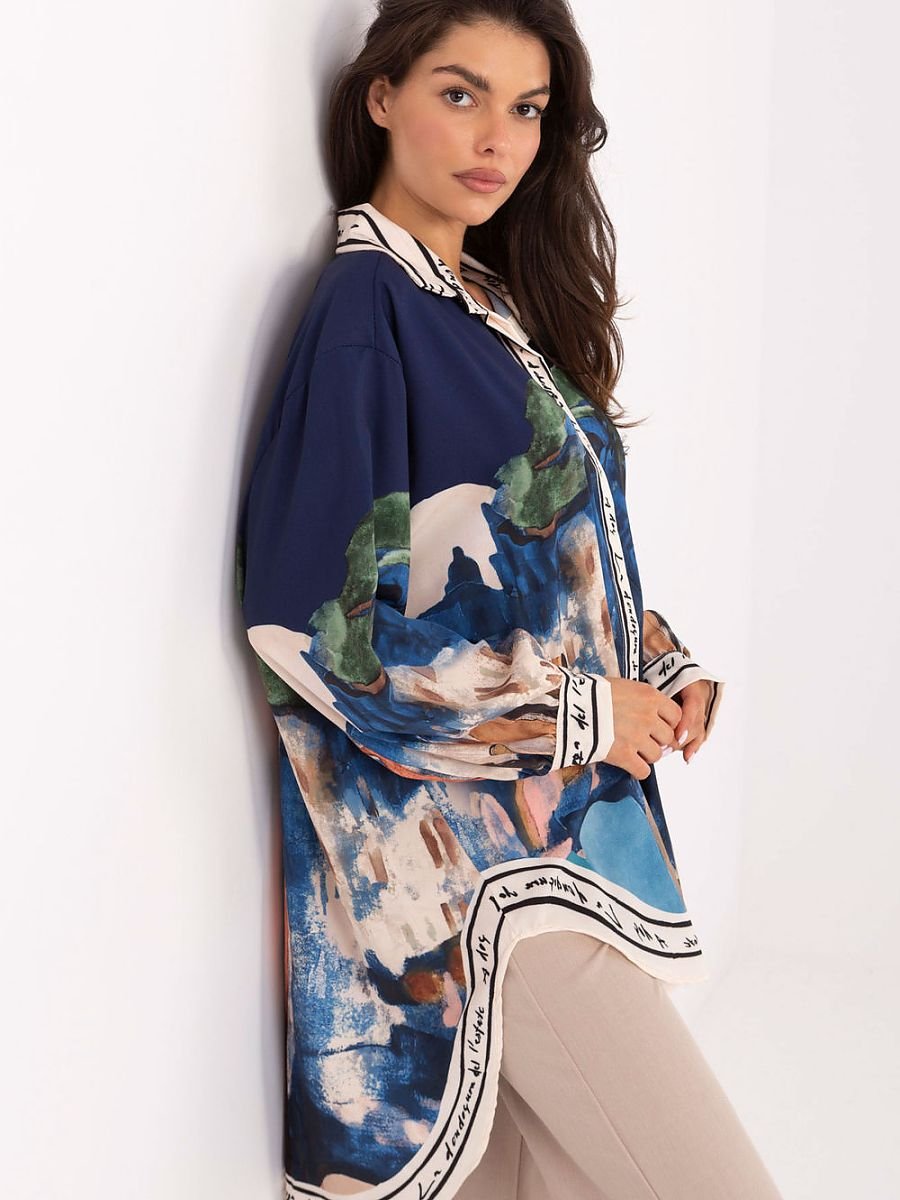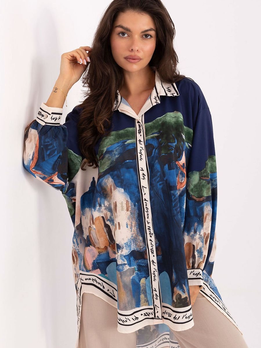 Koszula damska w stylu casual, idealna na co dzień oraz do pracy. Wykonana z lekkiej i przyjemnej w dotyku mieszanki wiskozy i poliestru, gwarantuje komfort noszenia przez cały dzień. Model o dłuższym kroju z klasycznym kołnierzykiem i długimi rękawami zapinanymi na guziki, ukryte pod elegancką listwą. Na całej powierzchni materiału znajduje się nadruk, a dodatkowe detale w postaci napisów na kołnierzyku, listwie i wokół dołu nadają koszuli nowoczesnego, nietuzinkowego charakteru. To propozycja dla kobiet ceniących wygodę połączoną z oryginalnym stylem.