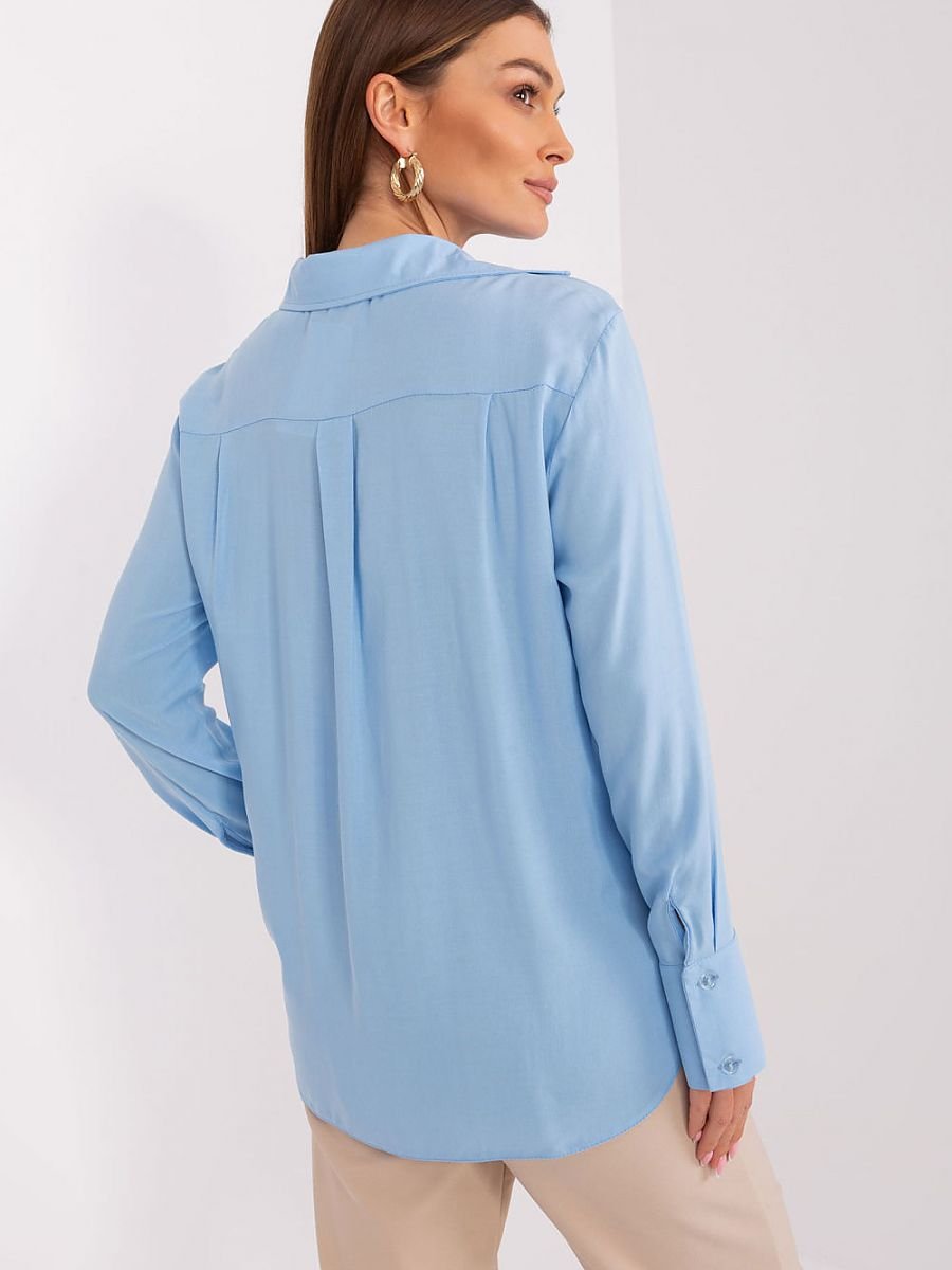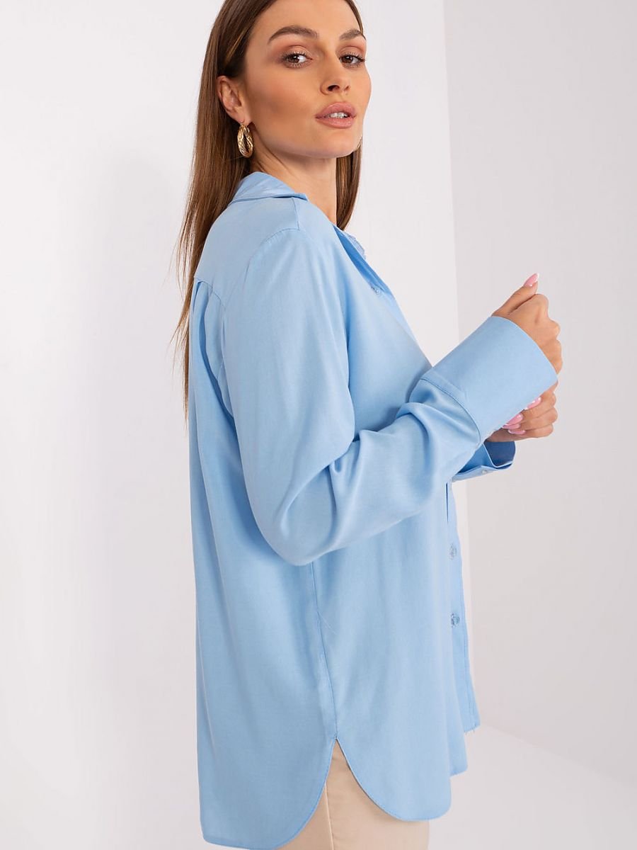 Koszula damska z długim rękawem oraz kołnierzykiem. Koszula zapinana na guziki, dół wykończony na półokrągło.