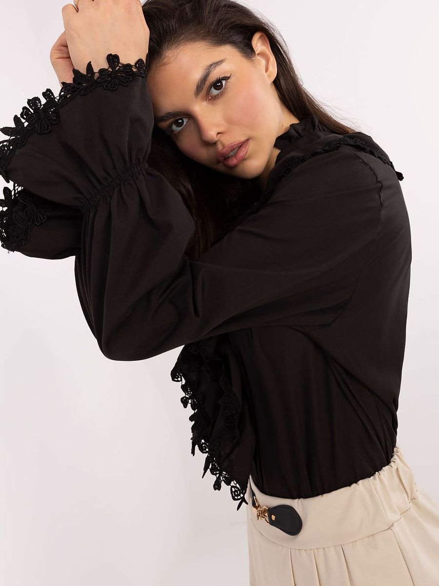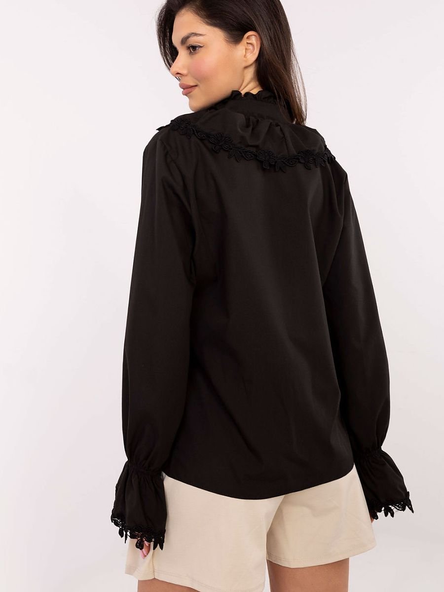 Elegancka damska koszula o klasycznym kroju, idealna na różne okazje do pracy, na spotkania wizytowe czy na co dzień, gdy zależy Ci na stylowym wyglądzie. Wykonana z wysokiej jakości bawełny, zapewnia komfort noszenia i doskonałe dopasowanie. Gładki materiał podkreśla minimalistyczny, a zarazem szykowny charakter koszuli. Model o standardowej długości z długimi rękawami zakończonymi mankietami, które zdobi subtelna koronka. Dekolt w formie stójki dodaje elegancji, a żabot na przodzie, również wykończony koronką, nadaje całości wyjątkowego, kobiecego akcentu. Koszula zapinana na guziki to połączenie klasyki i finezyjnych detali, idealne do spódnic, eleganckich spodni czy garniturów.