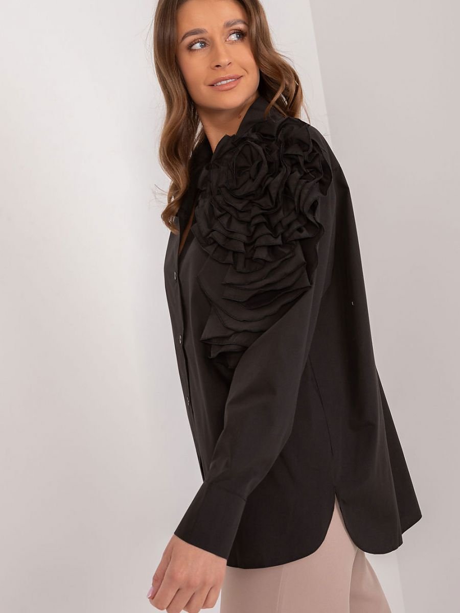 Koszula damska, która w elegancki sposób podkreśla kobiecą stylizację. Wykonana z gładkiego materiału, zapewniającego komfort i swobodę ruchów. Jej klasyczny fason, zapinany na guziki, sprawia, że nadaje się idealnie na wiele okazji, zwłaszcza te bardziej formalne. Na przodzie, na wysokości lewego ramienia, znajduje się duży, ozdobny materiałowy kwiat, który dodaje koszuli wyjątkowego uroku i subtelności. Długi rękaw podkreśla elegancję i klasykę koszuli, idealnie pasując do wielu różnych stylizacji. Głównym materiałem używanym do produkcji koszuli jest wysokiej jakości bawełna, co zapewnia naturalne oddychanie skóry i komfort noszenia przez cały dzień. Ta koszula to doskonały wybór dla kobiet ceniących sobie elegancję i indywidualny styl w każdej sytuacji.