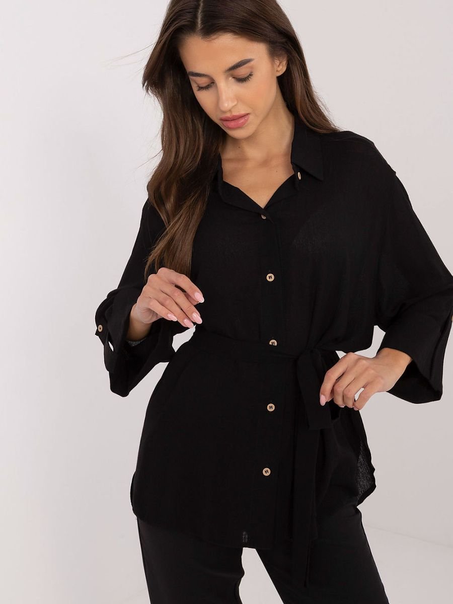 Casualowa damska koszula, idealna na co dzień oraz do pracy. Wykonana z gładkiego, jednokolorowego materiału, którego dominującym składnikiem jest bawełna, zapewnia komfort i przewiewność. Posiada klasyczny kołnierzyk oraz rękawy o długości 3/4, co dodaje jej swobodnego, ale jednocześnie stylowego charakteru. Koszula o standardowej długości, zapinana na guziki, dodatkowo wyposażona jest w pasek do wiązania, który podkreśla talię i dodaje kobiecego akcentu. To uniwersalna propozycja, idealna do casualowych stylizacji, łącząca wygodę z klasycznym stylem.