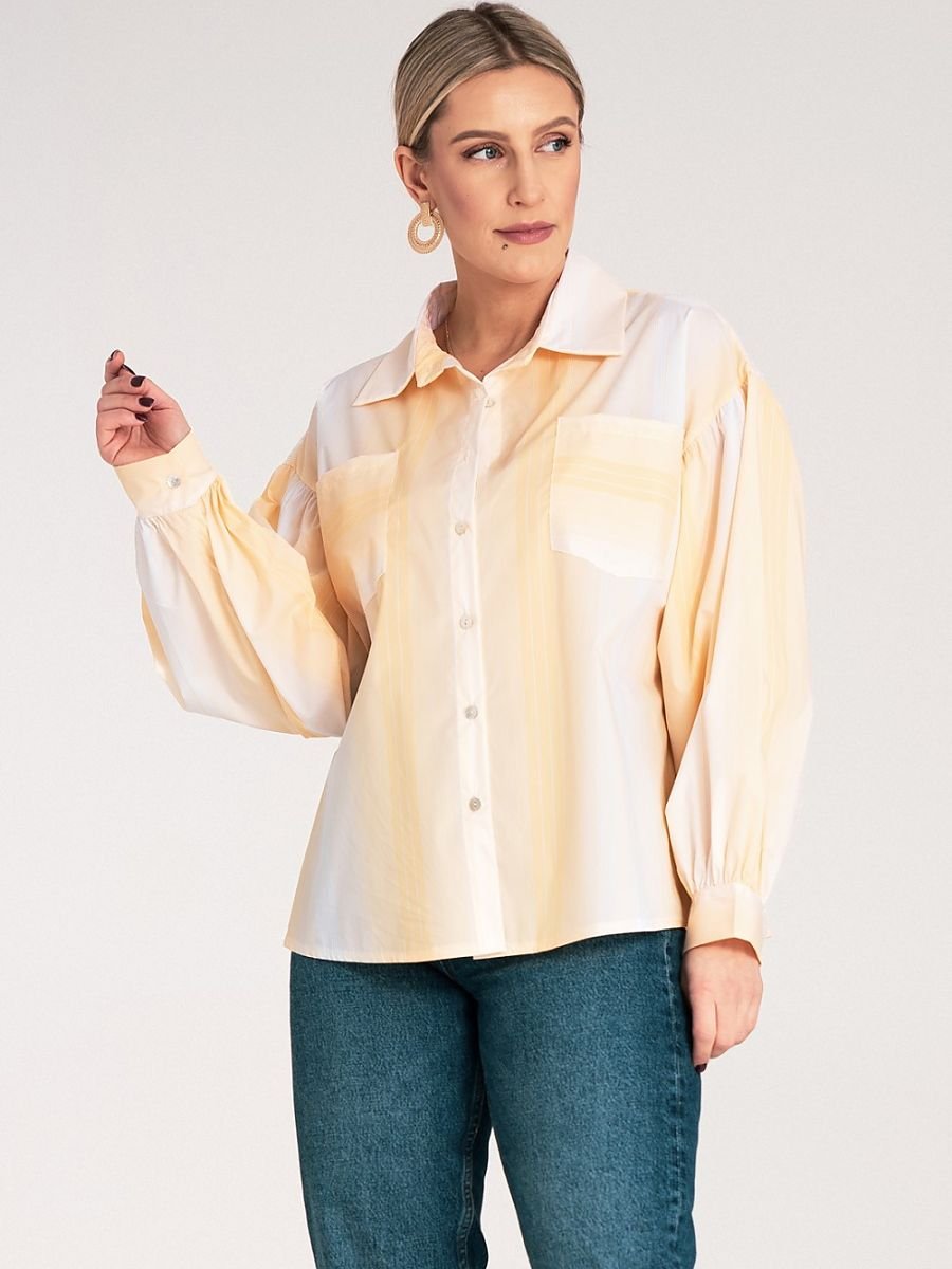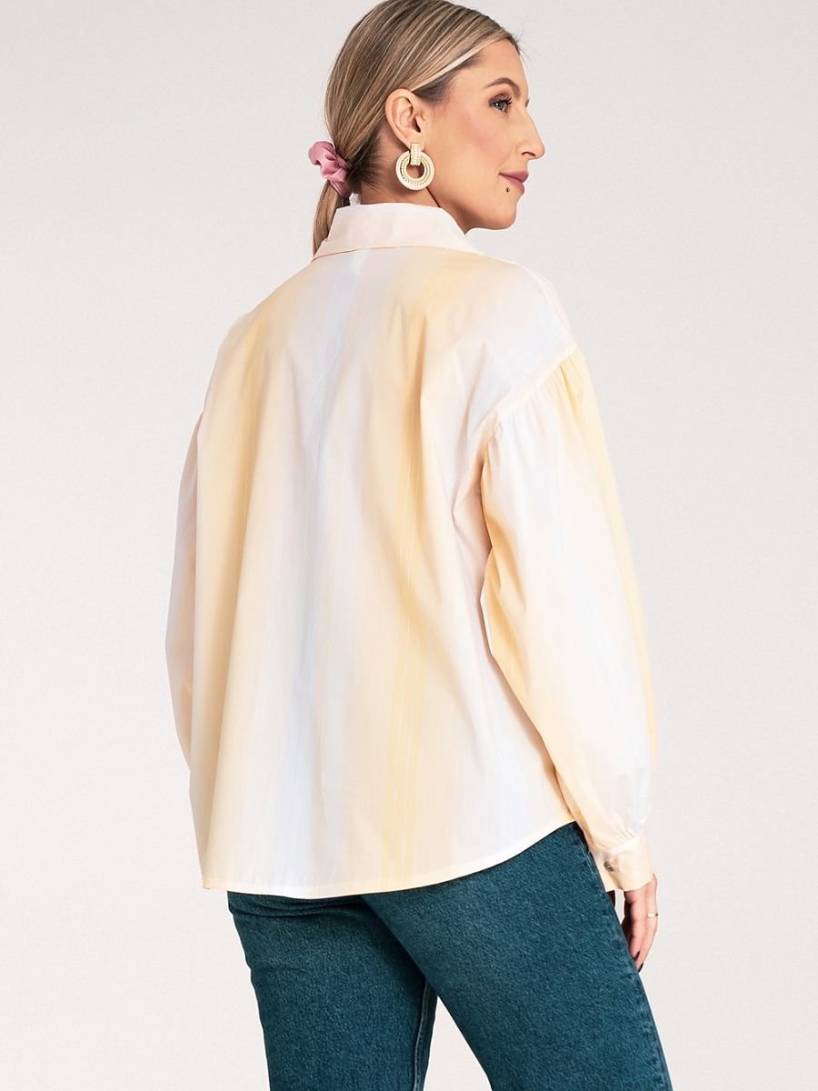 Koszula damska z delikatnym wzorem w paski. Model z obszernymi rękawami z marszczeniem. Wiązanie na dole.