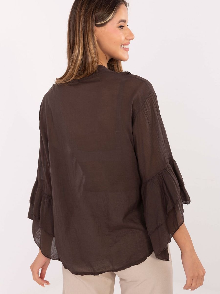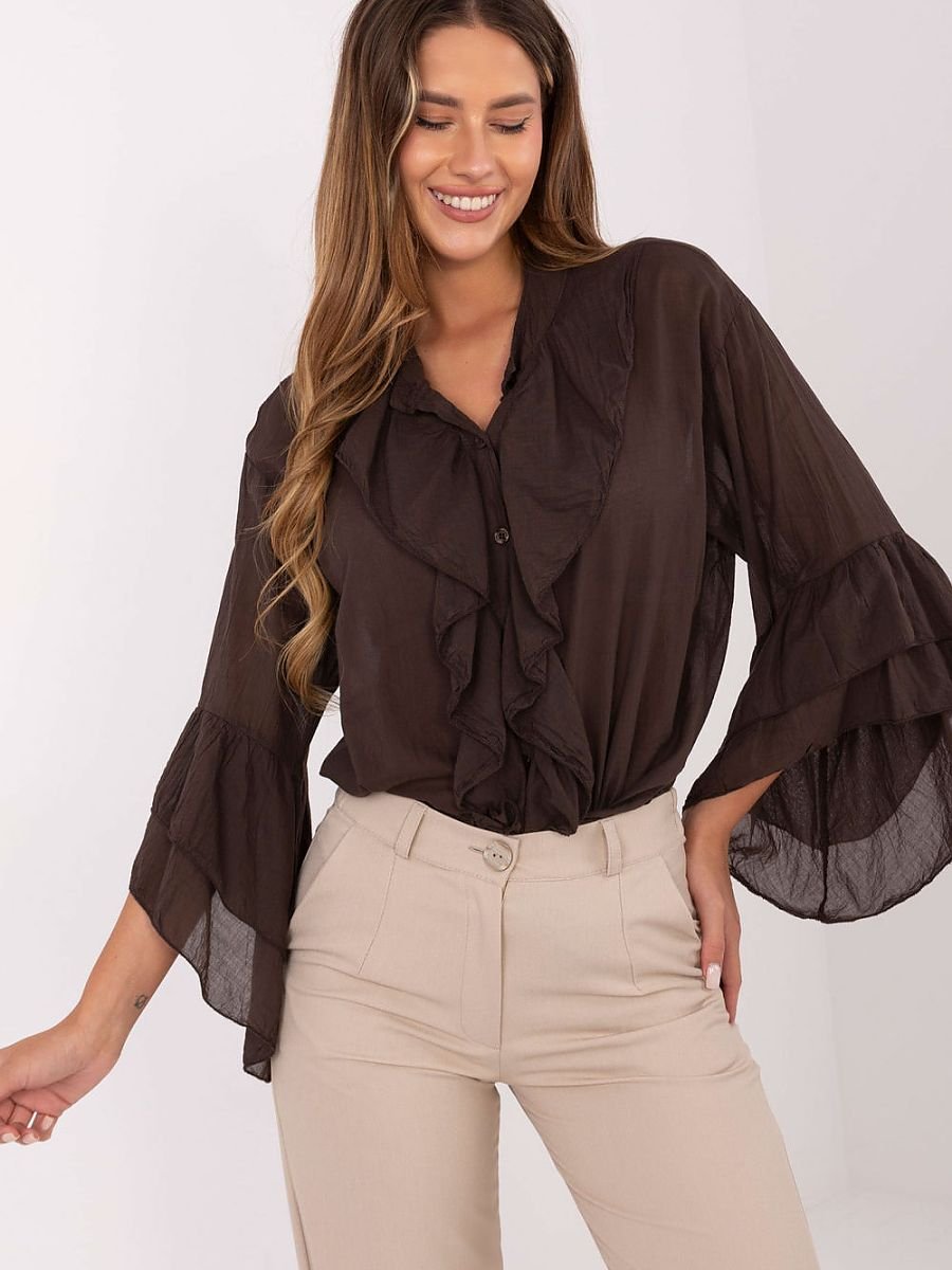 Stylowa i kobieca koszula klasyczna to połączenie elegancji i wygody, idealna zarówno do pracy, jak i na codzienne, wizytowe okazje. Wykonana z wysokiej jakości bawełny, zapewnia komfort noszenia i doskonałą przewiewność przez cały dzień. Model o standardowej długości ma rękawy 3/4 zakończone delikatnymi falbanami, które dodają mu subtelnego, romantycznego charakteru. Okrągły dekolt oraz zapięcie na guziki podkreślają klasyczny styl koszuli, a żabot na przodzie stanowi elegancki akcent, nadając całości wyjątkowego uroku. Gładki wzór sprawia, że koszula doskonale komponuje się z eleganckimi spodniami, spódnicą lub marynarką, tworząc stylowy zestaw do biura czy na spotkania biznesowe.