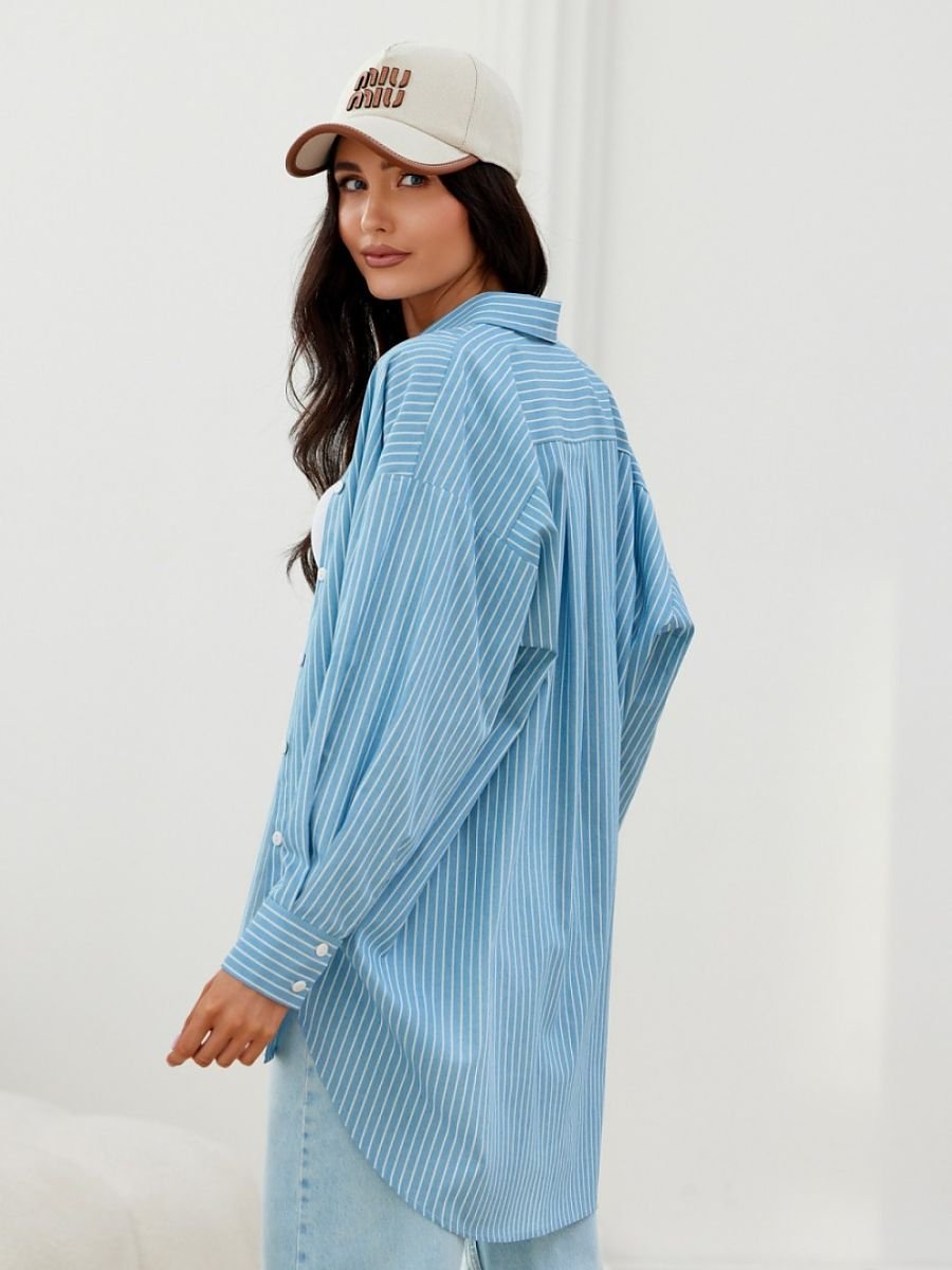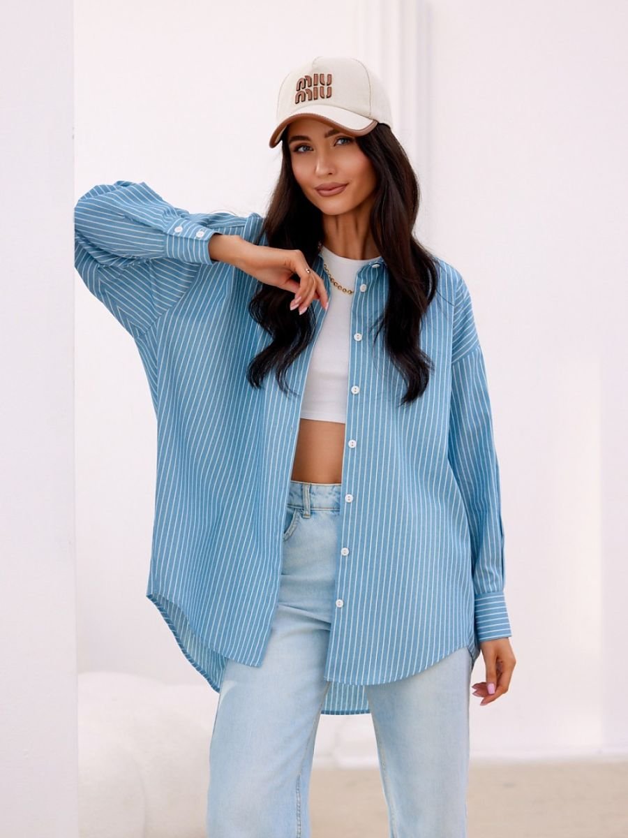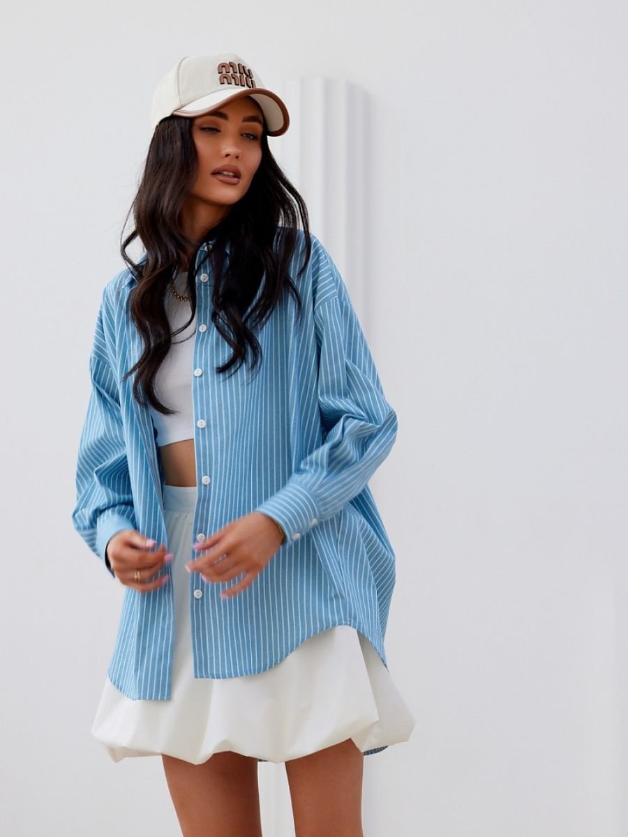 Koszula typu oversize z długimi rękawami zakończonymi ozdobnymi mankietami zapinanymi na guziki. Posiada asymetryczny krój, zapinana na guziki.