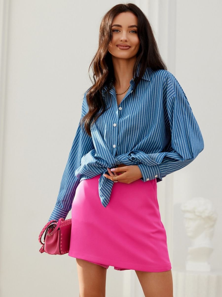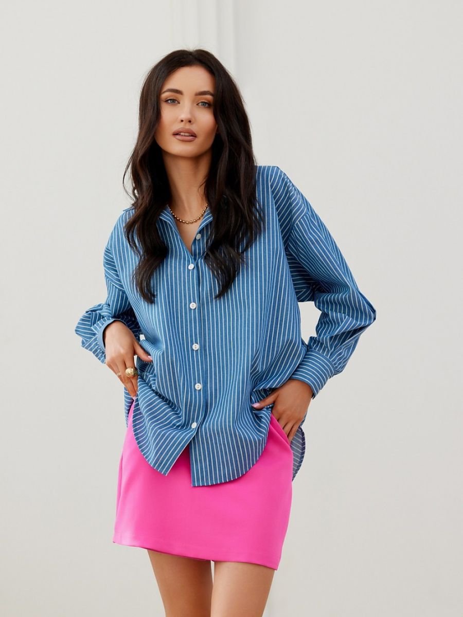 Koszula typu oversize z długimi rękawami zakończonymi ozdobnymi mankietami zapinanymi na guziki. Posiada asymetryczny krój, zapinana na guziki.