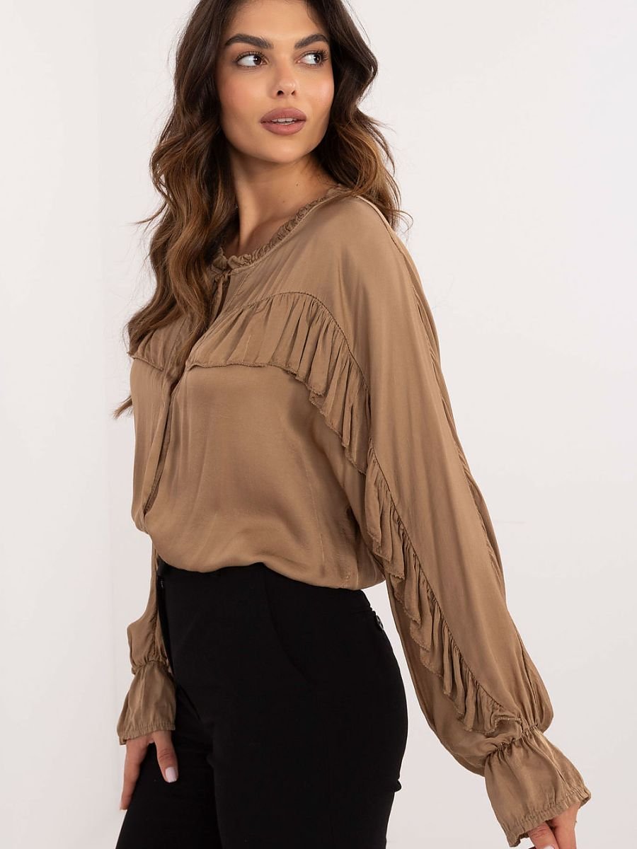 Idealna propozycja dla kobiet ceniących sobie niebanalny styl i komfort. Doskonale sprawdzi się zarówno w codziennych stylizacjach, jak i w bardziej formalnych sytuacjach, np. w pracy. Miękka i delikatna wiskoza zapewnia przyjemne uczucie podczas noszenia. Gładki materiał dodaje elegancji. Klasyczny krój koszuli, który został unowocześniony dzięki oryginalnym detalom. Długie rękawy zakończone efektowną falbaną dodają romantycznego charakteru. Zmysłowy dekolt z wiązaniem pozwala na indywidualną regulację. Praktyczne guziki umożliwiają łatwe zakładanie i zdejmowanie bluzki. Falbana na przodzie oraz na rękawach dodaje lekkości i ruchu.
