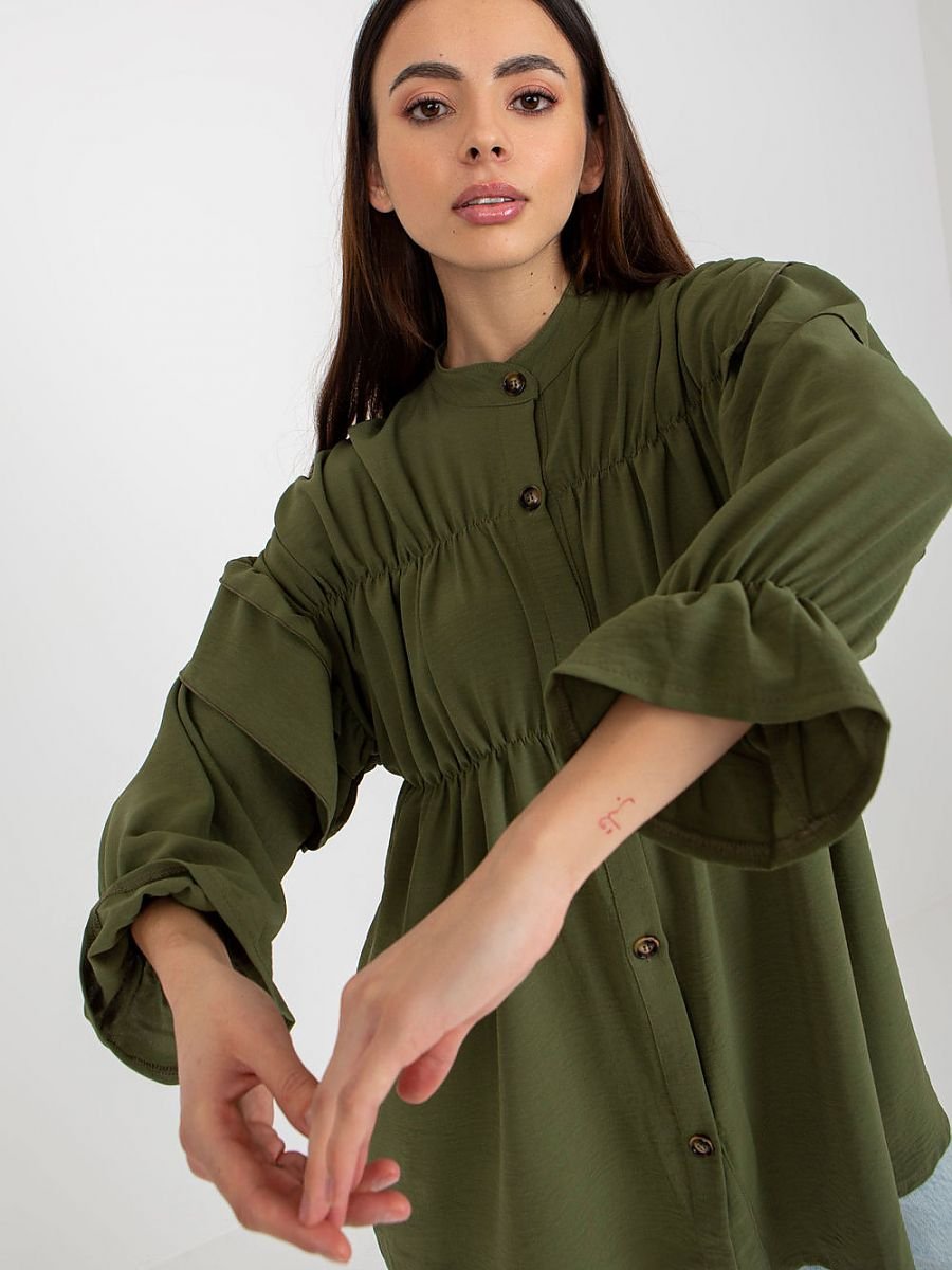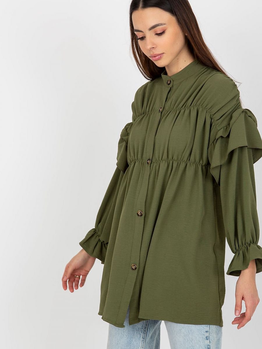 Koszula damska o luźnym kroju zapinana na guziki. Koszula z długim rękawem z ozdobnymi falbankami.