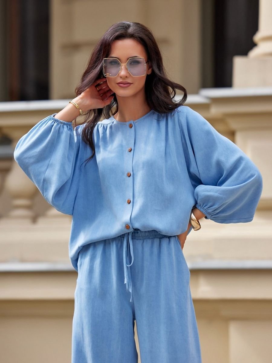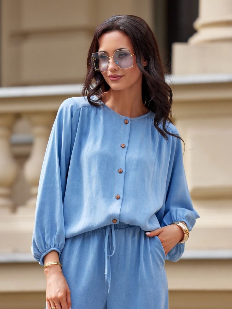 Bluzka o kroju loose fit z obszernymi rękawami. Zapinana z przodu na guziki, umożliwia regulację dekoltu. Fason koszulowy, tył lekko wydłużony.