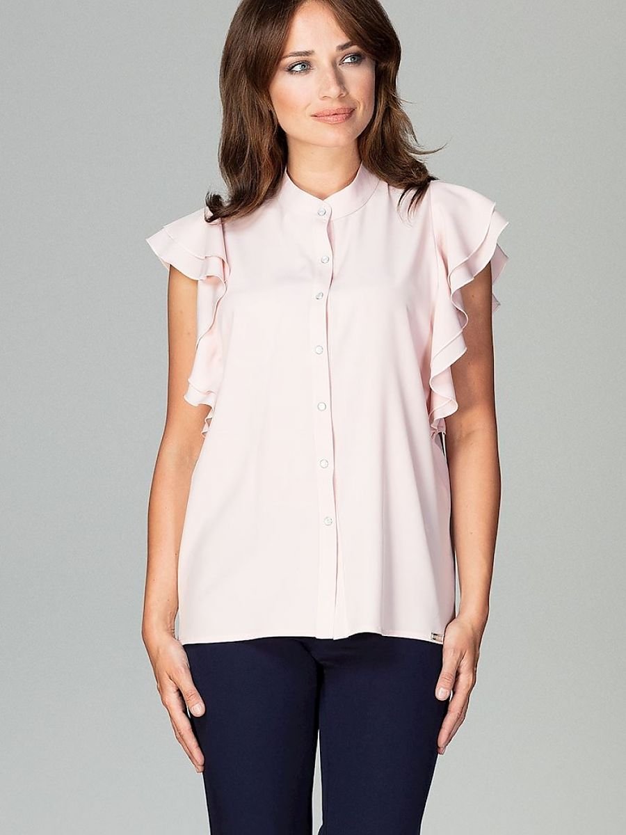 Ponadczasowa klasyka w najlepszym wydaniu. Model ma luźny krój, rękawki wykończone są falbankami, zapinana na ozdobne napy. Koszula powinna się znaleźć w garderobie każdej, aktywnej zawodowo kobiety.