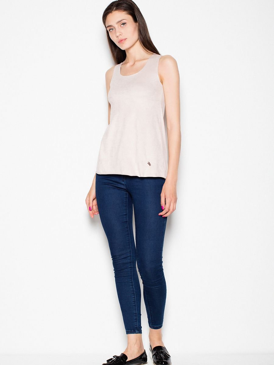 Lekka zamszowa bluzka na ramiączkach z półokrągłym dekoltem. Model o luźnym kroju, świetny do codziennych stylizacji.