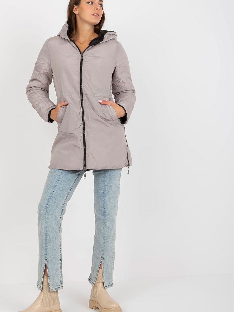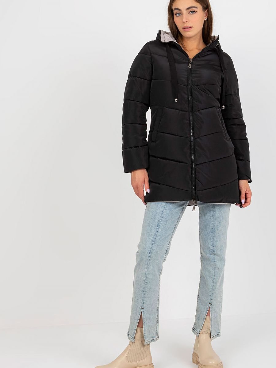 Pikowana dwustronna kurtka damska, zapinana na zamek. Kurtka z kapturem oraz kieszeniami wsuwanymi.