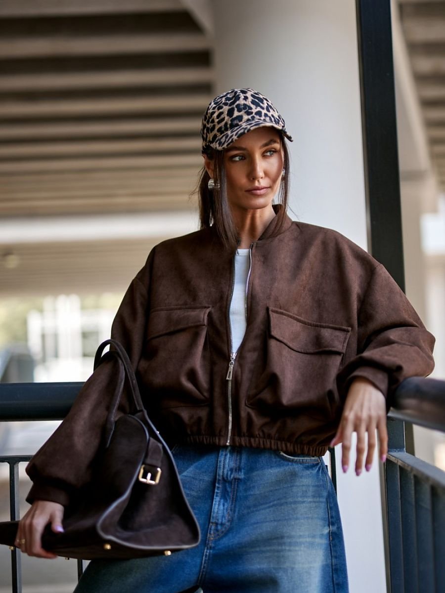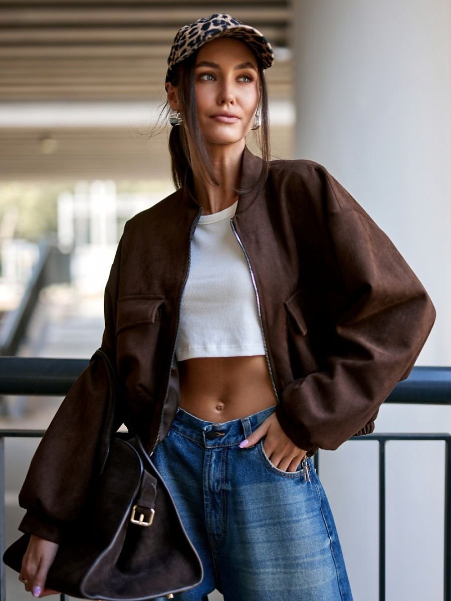 Bomberka Vivara powstała z wysokiej jakości imitacji zamszu, materiał jest miękki w dotyku, wytrzymały i ma eleganckie, matowe wykończenie. Kurtka wyróżnia się swobodnym krojem typu oversize, wygodnym zapięciem na suwak oraz dużymi kieszeniami naszywanymi z przodu, które nadają jej miejski, nowoczesny charakter. Uszyta w Polsce z dbałością o każdy detal, zachwyca precyzją wykonania i trwałością. Doskonale sprawdzi się w codziennych stylizacjach z jeansami i sneakersami, a zestawiona z eleganckimi spodniami stworzy ciekawy, modny kontrast.