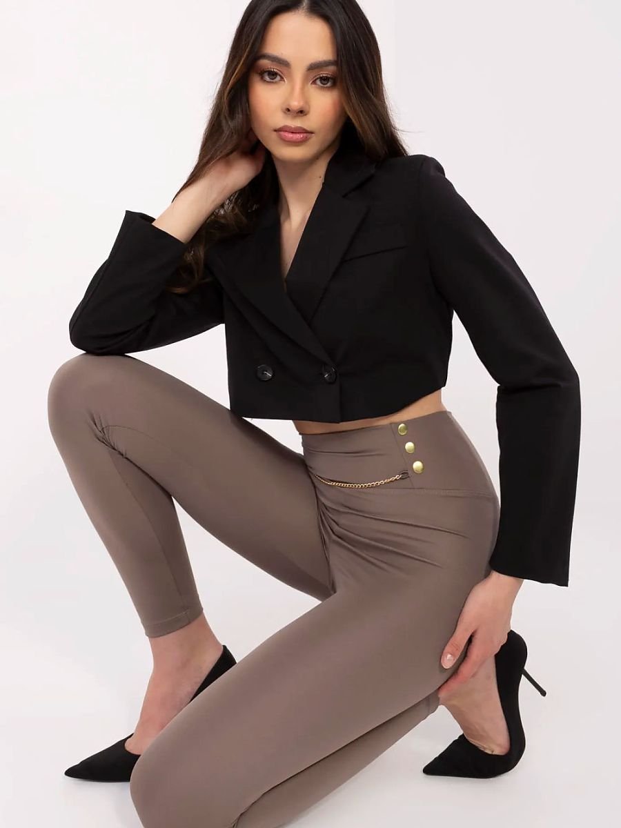 Stylowe legginsy damskie o długiej nogawce, idealne zarówno na co dzień, do pracy, jak i na imprezę. Wykonane z elastycznego materiału, połączenia poliestru i elastanu, gwarantują doskonałe dopasowanie do sylwetki oraz komfort noszenia przez cały dzień. Model o gładkim wzorze i zwężanych nogawkach pięknie podkreśla kształty, a wysoki stan zapewnia świetne dopasowanie w talii i dodatkowe poczucie wygody. Brak kieszeni i zapięcia sprawia, że legginsy mają czysty, nowoczesny fason. Subtelnym, a zarazem efektownym akcentem jest ozdobny łańcuszek, który dodaje całości elegancji i sprawia, że legginsy świetnie sprawdzą się również w bardziej wyjściowych stylizacjach.