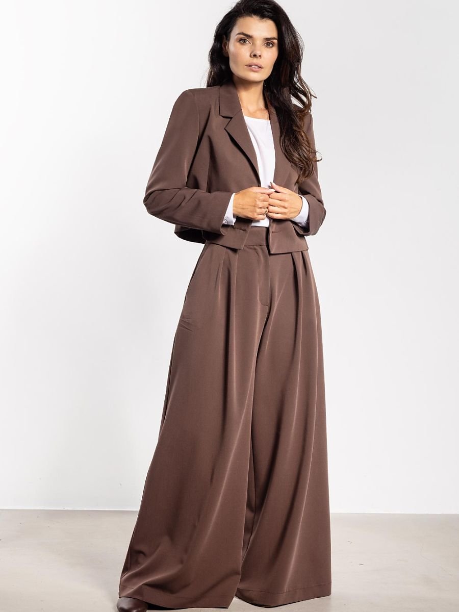 Stylowa marynarka o luźnym kroju łączy klasykę z nowoczesnym charakterem. Krótszy fason nadaje lekkości, a dwurzędowe zapięcie na guziki podkreśla elegancję. Klasyczne klapy i prosta linia ramion sprawiają, że marynarka prezentuje się profesjonalnie i szykownie, jednocześnie zapewniając komfort noszenia. Doskonale komponuje się zarówno z szerokimi spodniami, jak i spódnicą czy sukienką, tworząc uniwersalny i efektowny look na różne okazje.