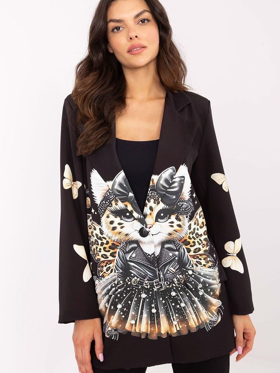 Elegancka damska marynarka o casualowym stylu, doskonała na co dzień, do pracy, na imprezę oraz wizytowe okazje. Wykonana z lekkiej mieszanki wiskozy i poliestru, idealna na wiosnę i lato. Kolorowy nadruk nadaje jej nowoczesnego i odważnego charakteru, wyróżniając ją spośród klasycznych modeli. Marynarka ma standardową długość, długi rękaw oraz jednorzędowe zapięcie na guzik, które podkreśla jej elegancki wygląd. Wszyte poduszki na ramionach nadają jej wyrazistości i subtelnie modelują sylwetkę. Klasyczne klapy oraz podszewka dodają całości stylowego wykończenia. Bez ocieplenia, więc świetnie sprawdzi się w cieplejsze dni. To idealny wybór dla kobiet, które chcą połączyć elegancję z nowoczesnym designem i wygodą.