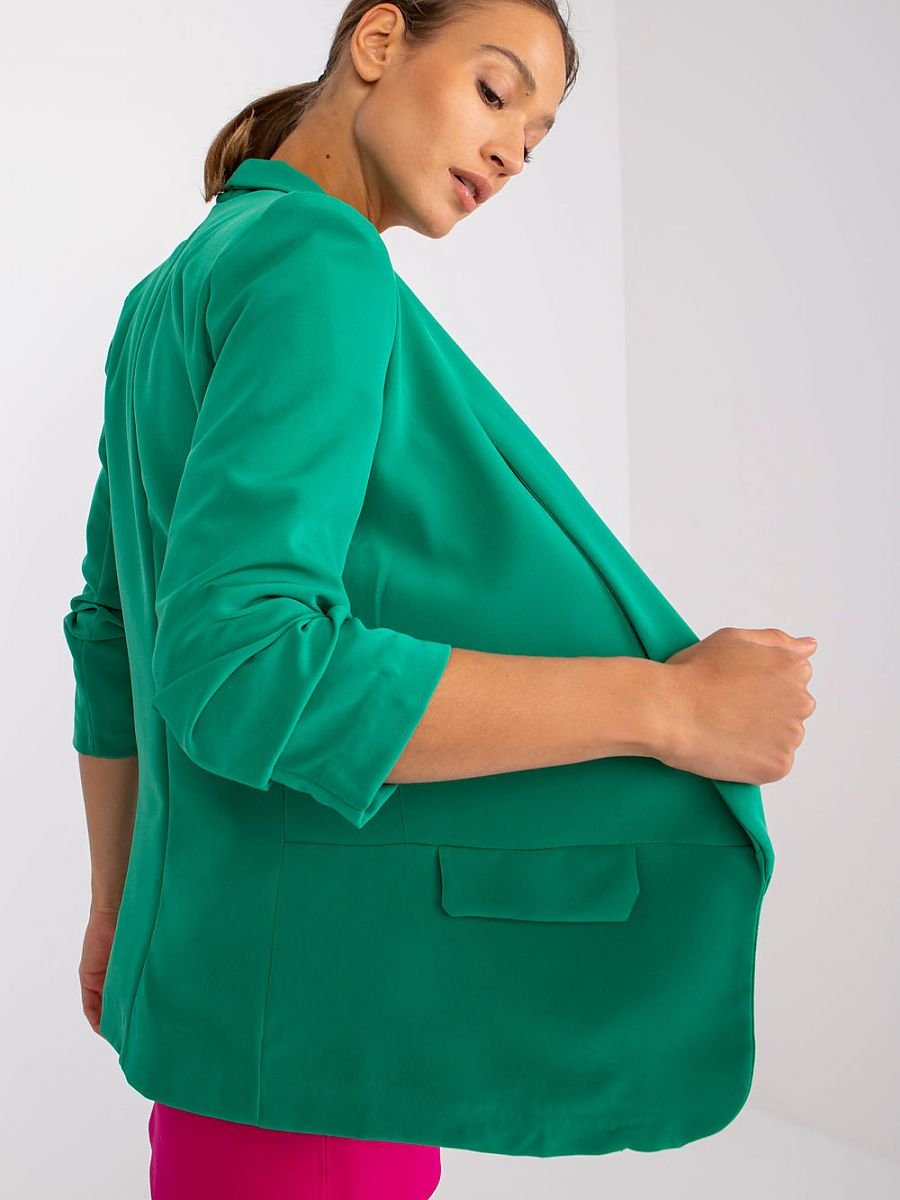 Marynarka damska z rękawem 3/4, bez zapięcia. Marynarka na podszewce, z imitacją kieszeni. Na ramionach wszyte poduszki. Idealna propozycja na wiele okazji.