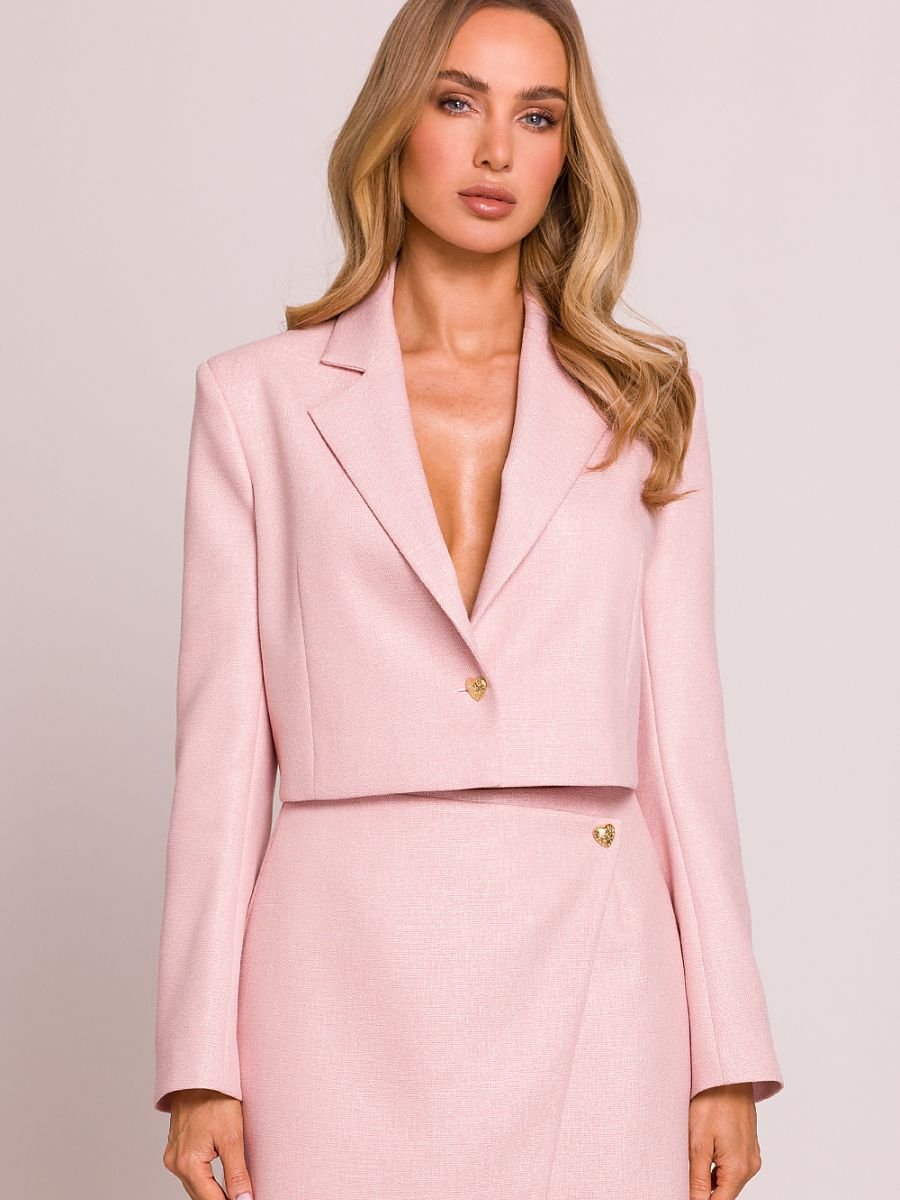 Elegancka krótka marynarka o ponadczasowym kroju, wykonana z wysokiej jakości tkaniny. Klasyczny kołnierz nadaje jej szyku, a ozdobny guzik w kształcie serca dodaje subtelnego, wyjątkowego akcentu. Model jest w całości na podszewce, co zapewnia komfort noszenia i perfekcyjne układanie się na sylwetce. Doskonale komponuje się zarówno z eleganckimi, jak i casualowymi stylizacjami. Zaprojektowana i uszyta w Polsce z dbałością o każdy detal.