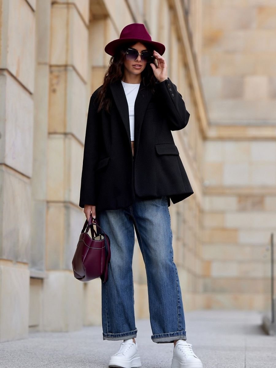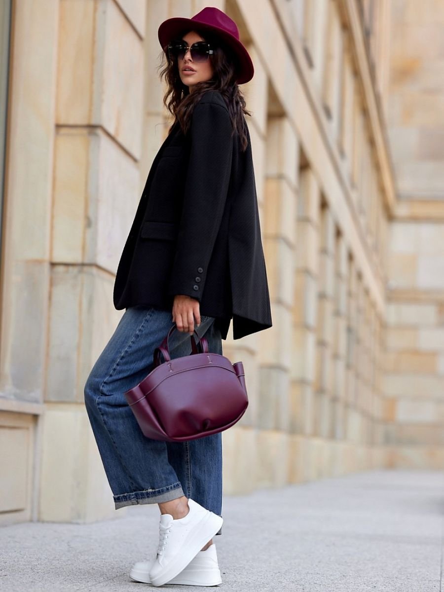 Marynarka o obszernym kroju to niezwykle stylowy element garderoby, który łączy elegancję z odrobiną luzu. Lekko obniżona linia ramion nadaje jej nowoczesny, modny wygląd, a długie rękawy oraz efektowne guziki przy mankietach dodają jej charakteru. Klapy, które przechodzą w ozdobny kołnierzyk, stanowią subtelny element dekoracyjny, czyniąc całość większym wyrazem stylu. Zapinana na guziki, prezentuje się niezwykle elegancko, a imitacje kieszeni po bokach potrafią wzbogacić każdą stylizację. Dzięki podszewce, marynarka jest komfortowa i przyjemna w noszeniu, co sprawia, że możesz ją nosić przez cały dzień, zarówno w biurze, podczas spotkań, jak i na mniej formalnych wyjściach. Idealnie sprawdzi się w różnorodnych zestawieniach. Można ją połączyć z klasyczną małą czarną, dodając odrobiny elegancji, lub zestawić ze sportowym lookiem, granatowe jeansy i trampki będą świetnym uzupełnieniem casualowej stylizacji. Dzięki temu modelowi, każda kobieta będzie mogła wyrazić swój unikalny styl, niezależnie od okazji. Produkt jest wyprodukowany i uszyty w Polsce.