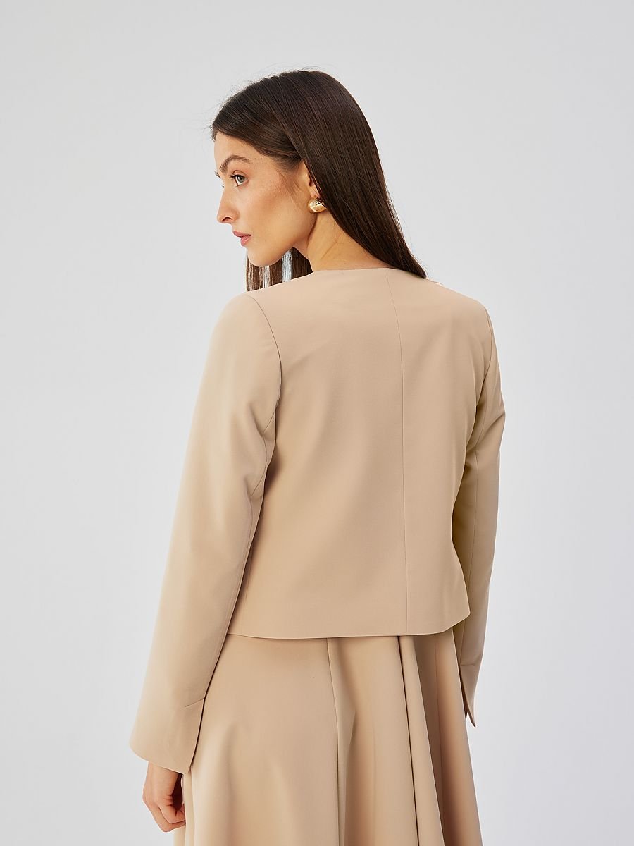 Krótka marynarka to wyjątkowy element garderoby, charakteryzujący się krótkim krojem, co nadaje mu nowoczesny i dynamiczny wygląd. Bez kołnierza oraz z brakiem tradycyjnego zapięcia, ta marynarka prezentuje się stylowo i nieformalnie. Jej długie rękawy dodają elegancji, jednocześnie utrzymując lekki charakter. Z przodu na piersi znajduje się imitacja kieszeni, co nadaje marynarce nutkę swobodnego szyku. Cała marynarka jest starannie wykończona i wyściełana na podszewce, co zapewnia nie tylko estetyczny wygląd, ale także komfort noszenia. To idealny wybór dla tych, którzy poszukują eleganckiego, lecz jednocześnie swobodnego elementu garderoby, idealnego do różnych okazji. Zaprojektowane i uszyte w Polsce.