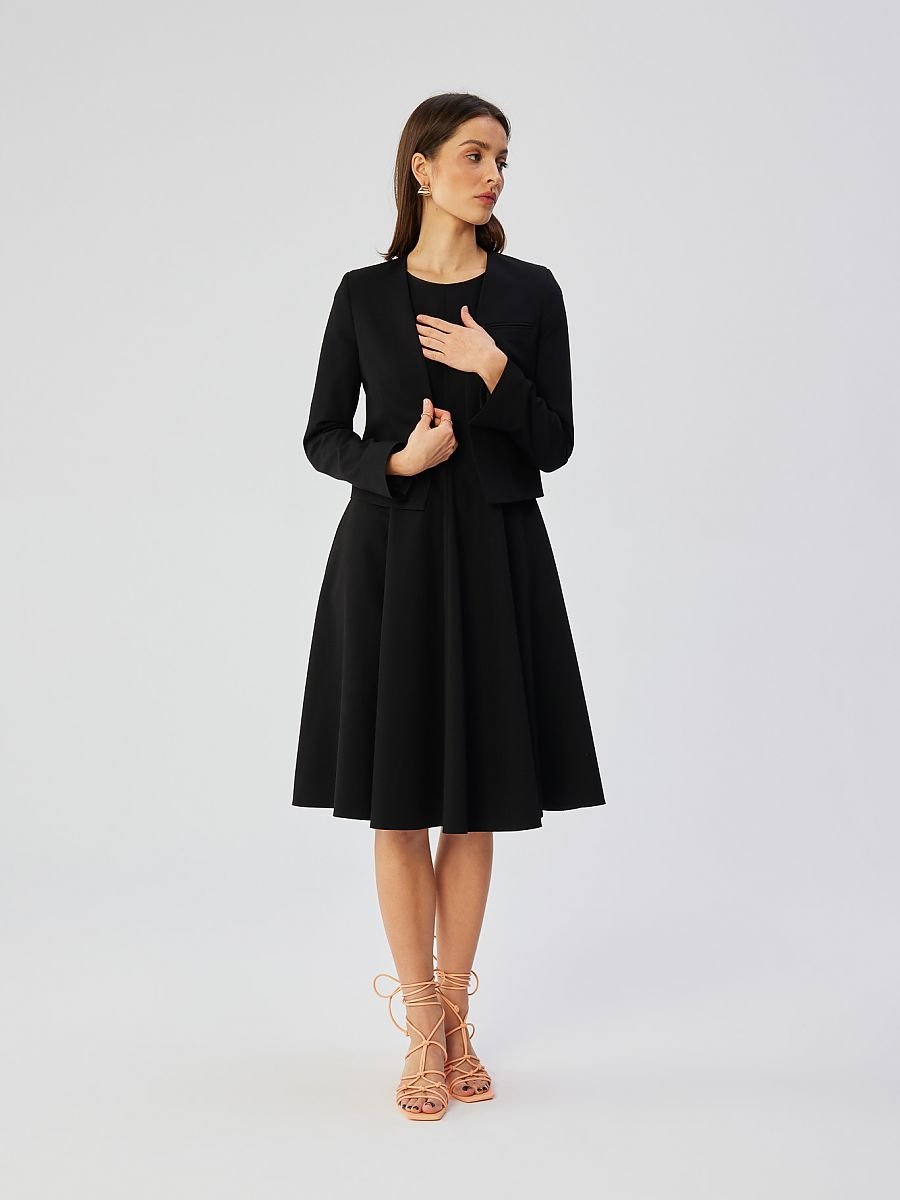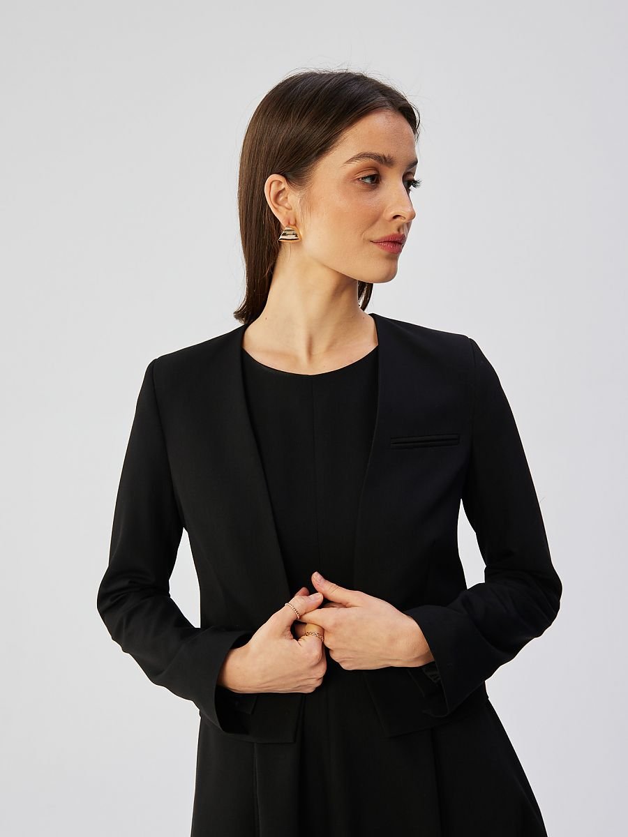 Krótka marynarka to wyjątkowy element garderoby, charakteryzujący się krótkim krojem, co nadaje mu nowoczesny i dynamiczny wygląd. Bez kołnierza oraz z brakiem tradycyjnego zapięcia, ta marynarka prezentuje się stylowo i nieformalnie. Jej długie rękawy dodają elegancji, jednocześnie utrzymując lekki charakter. Z przodu na piersi znajduje się imitacja kieszeni, co nadaje marynarce nutkę swobodnego szyku. Cała marynarka jest starannie wykończona i wyściełana na podszewce, co zapewnia nie tylko estetyczny wygląd, ale także komfort noszenia. To idealny wybór dla tych, którzy poszukują eleganckiego, lecz jednocześnie swobodnego elementu garderoby, idealnego do różnych okazji. Zaprojektowane i uszyte w Polsce.