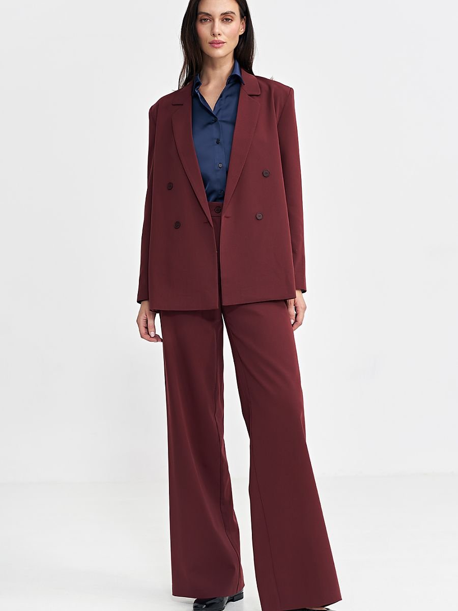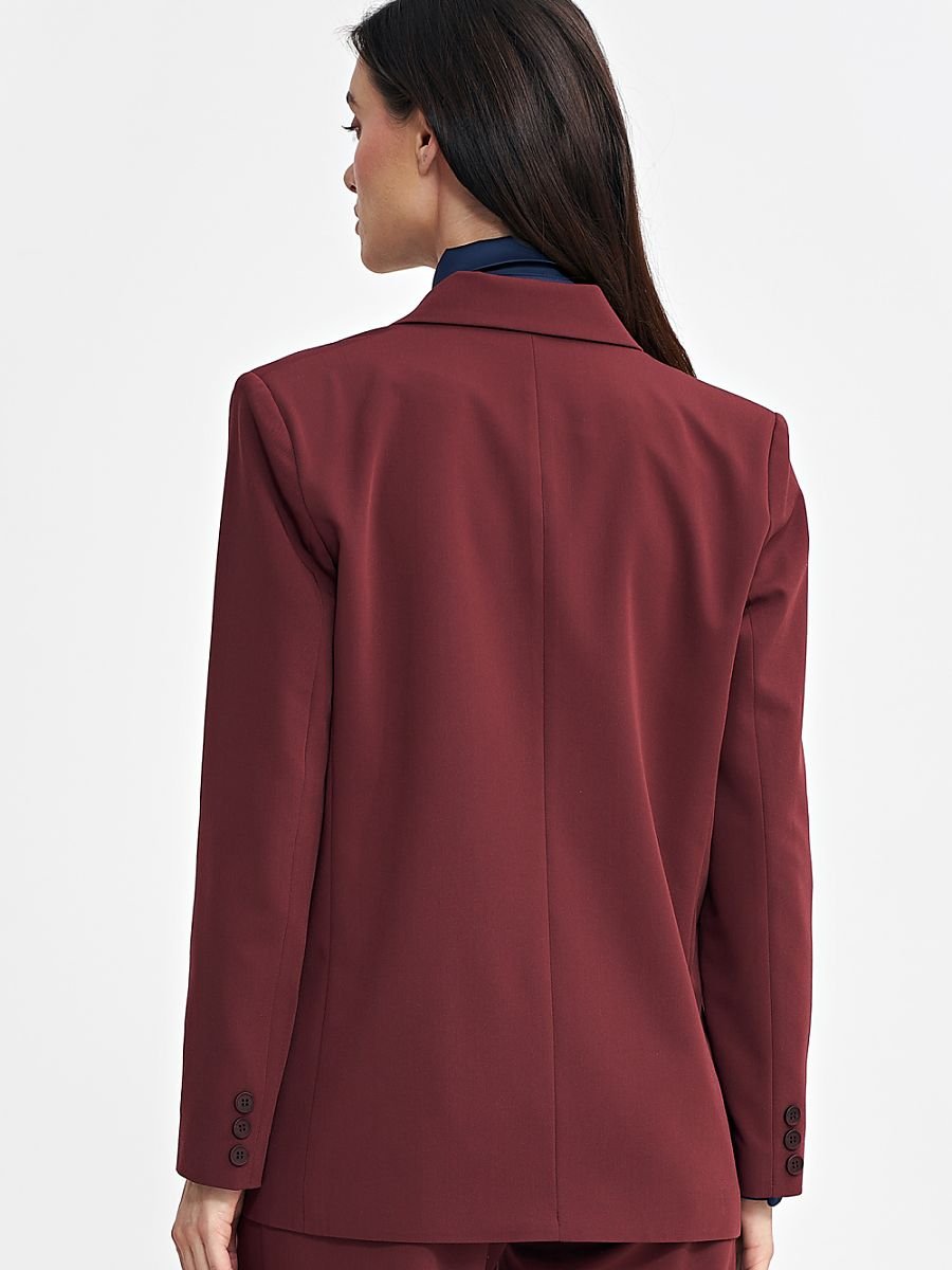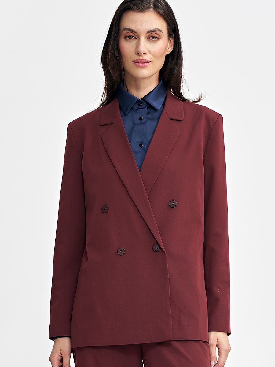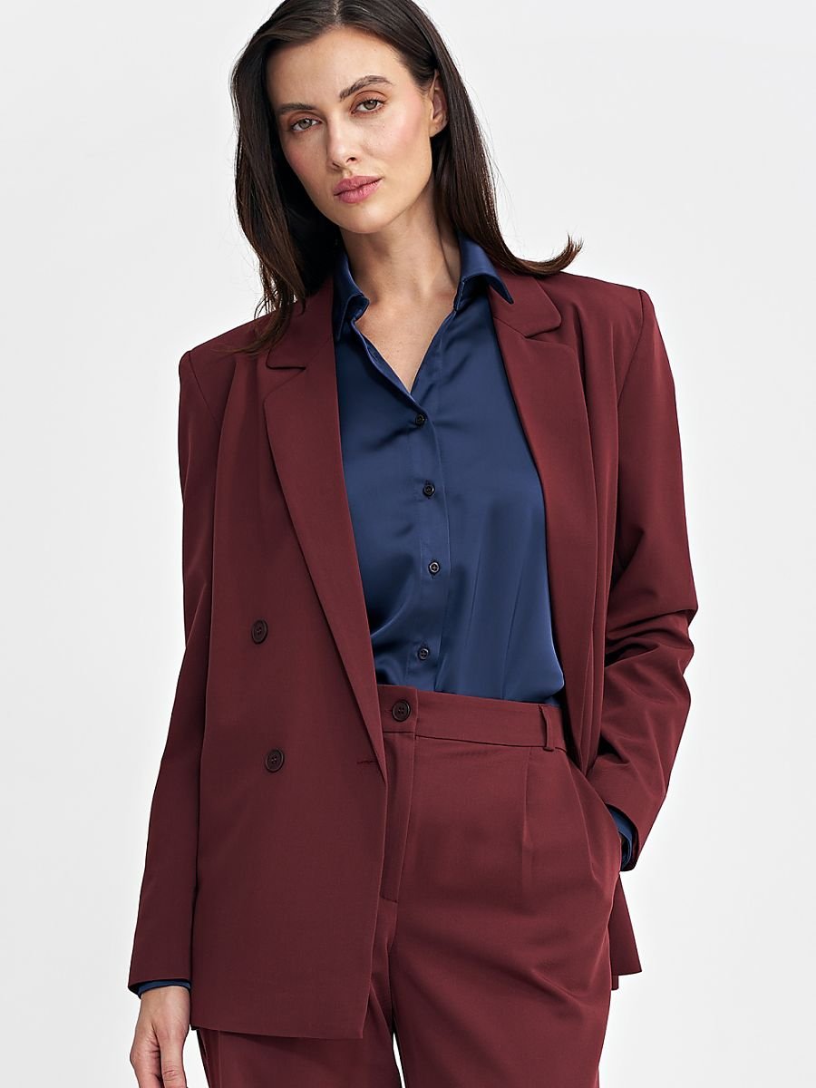 Damska marynarka o kroju oversize, która łączy elegancję z nowoczesnym stylem. Klasyczny kołnierz z wyłożonymi klapami dodaje formalnego charakteru, a długie rękawy z guzikami u dołu wprowadzają subtelne detale. Marynarka wyposażona jest w poduszki na ramionach, które nadają jej wyraźniejszy kształt i elegancką strukturę. Sięgająca za linię bioder długość sprawia, że jest wszechstronna i stylowa. Dwurzędowe zapięcie na guziki z przodu podkreśla jej klasyczny urok, a podszewka zapewnia dodatkowy komfort i eleganckie wykończenie. Idealna do tworzenia zarówno codziennych, jak i bardziej formalnych stylizacji.