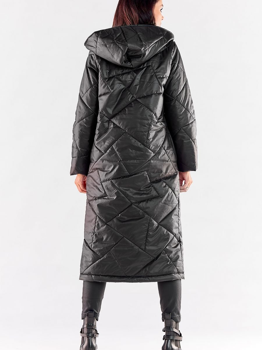 Długi, pikowany płaszcz z kieszeniami, zapinany na napy. Posiada duży kaptur, który może chronić przed deszczem oraz wiatrem. Idealnie sprawdzi się na chłodne jesienne wieczory oraz zimowe chłody. Dzięki bardzo modnej w tym sezonie długości można stworzyć z tym płaszczem wiele oryginalnych outfitów. Płaszcz w całości na podszewce.
