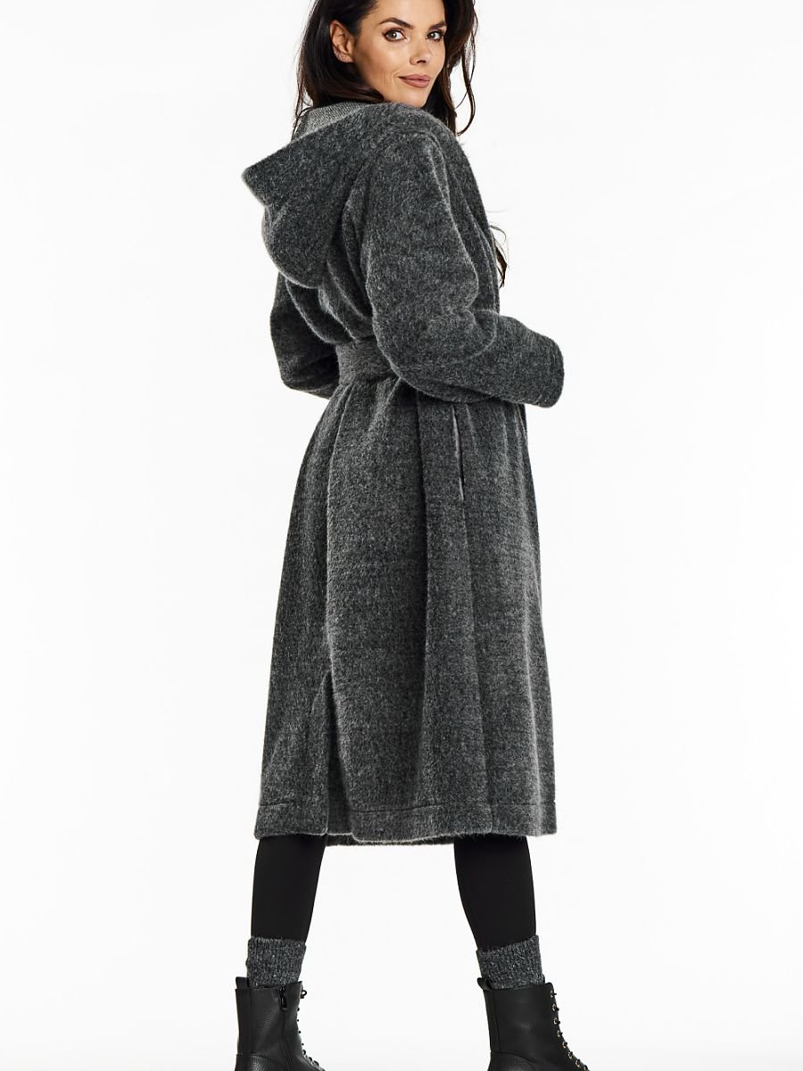 Długi płaszcz z kapturem zapinany na guziki. Odkryj elegancję z płaszczem z kołnierzem szalowym i kapturem od polskiej marki Awama. Idealny na jesień, łączy elegancję z casualowym stylem. Płaszcz ma elegancki kołnierz szalowy i kaptur, dodający nowoczesnego akcentu. Lekki, bez podszewki, przewiązywany w talii, podkreśla kobiecą sylwetkę. Uszyty z dzianiny typu miś, zapewnia ciepło i komfort w chłodniejsze dni. Minimalistyczny design, sprawdzi się zarówno na codziennych wyjściach, jak i formalnych okazjach.
