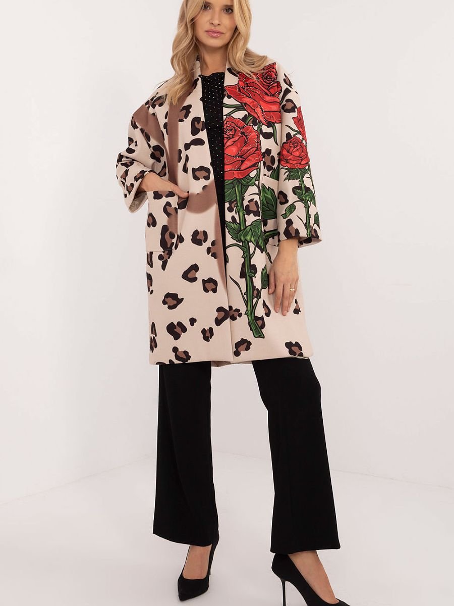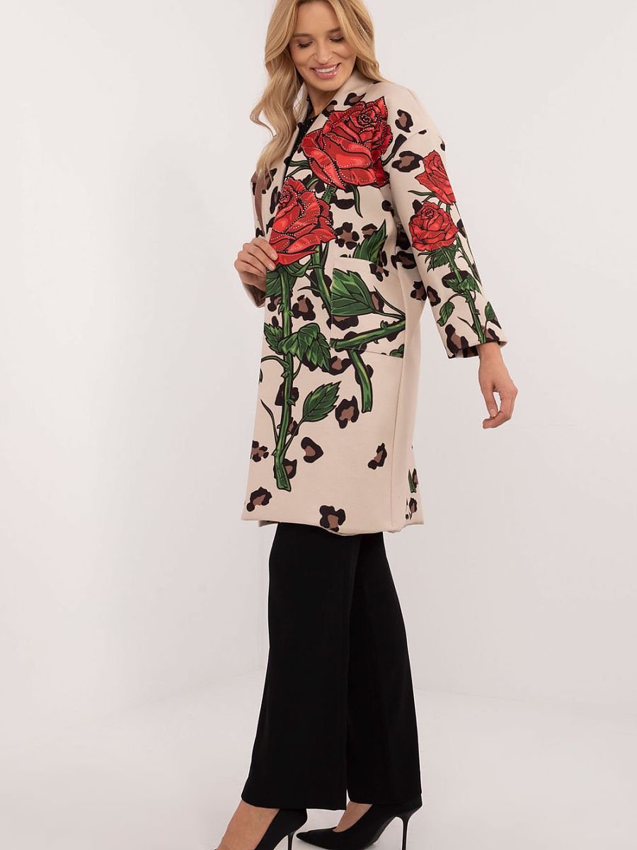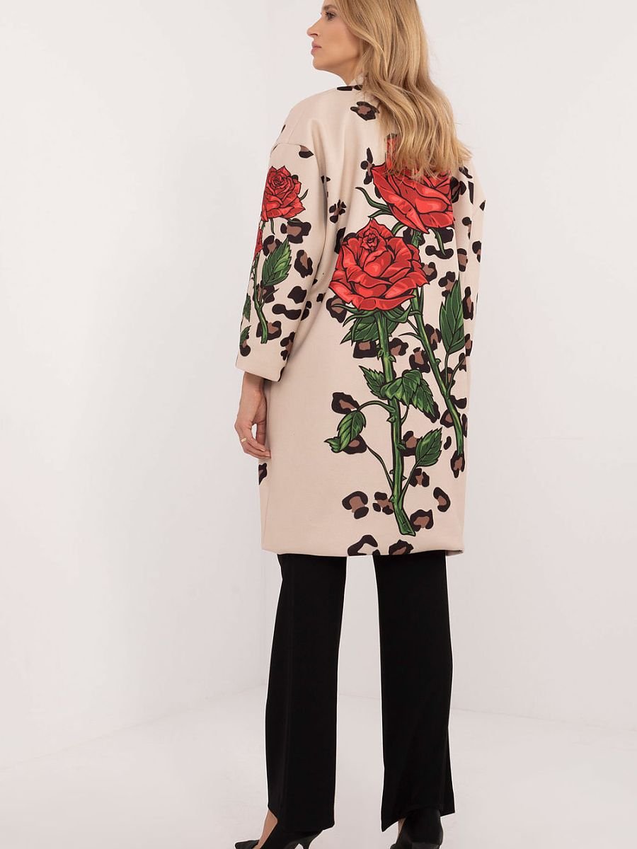 Damski płaszcz przejściowy bez zapięcia, doskonały na codzienne wyjścia oraz do pracy, w stylu casual. Płaszcz wykonany jest z lekkiego materiału bez ocieplenia, co sprawia, że idealnie nadaje się na sezon jesienno-zimowy oraz wiosenny. Ozdobiony efektownym nadrukiem róż na łodygach, który dodatkowo podkreślają subtelne dżety, nadaje całości wyjątkowego, eleganckiego charakteru. Standardowa długość oraz długie rękawy zapewniają wygodę, a wsuwane kieszenie dodają funkcjonalności. Płaszcz wyposażony w podszewkę, która zapewnia komfort noszenia i doskonale sprawdza się na co dzień, łącząc styl z wygodą i oryginalnością.