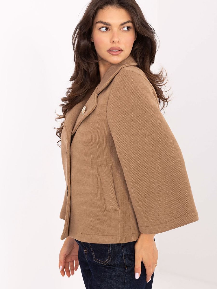Krótki płaszcz damski o eleganckim charakterze, idealny na sezon przejściowy jesień, zimę i wiosnę. Wykonany z wysokiej jakości mieszanki poliestru, wiskozy i elastanu, cechuje się gładką strukturą i komfortem noszenia. Model z wykładanymi klapami, zapinany jednorzędowo na guziki, posiada praktyczne wsuwane kieszenie. Rękawy 3/4 dodają lekkości, a ozdobna broszka na klapie podkreśla szykowny styl. Bez ocieplenia, świetnie sprawdzi się w codziennych oraz biurowych stylizacjach.