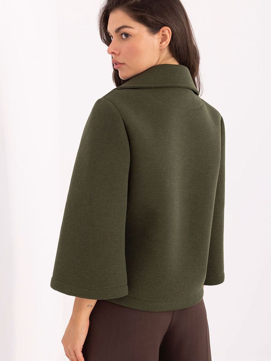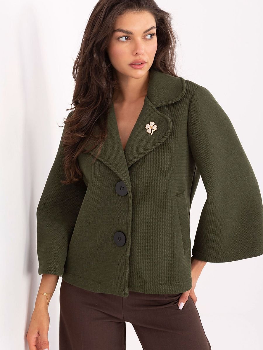 Krótki płaszcz damski o eleganckim charakterze, idealny na sezon przejściowy jesień, zimę i wiosnę. Wykonany z wysokiej jakości mieszanki poliestru, wiskozy i elastanu, cechuje się gładką strukturą i komfortem noszenia. Model z wykładanymi klapami, zapinany jednorzędowo na guziki, posiada praktyczne wsuwane kieszenie. Rękawy 3/4 dodają lekkości, a ozdobna broszka na klapie podkreśla szykowny styl. Bez ocieplenia, świetnie sprawdzi się w codziennych oraz biurowych stylizacjach.