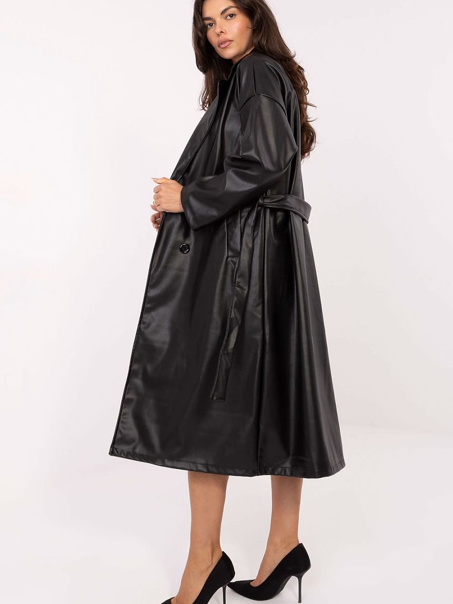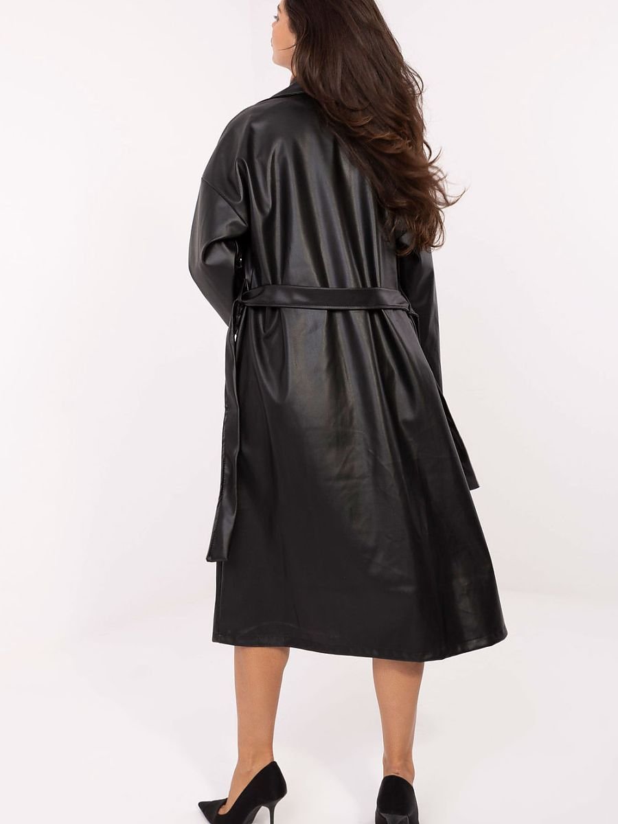 Damski płaszcz skórzany o ponadczasowym, casualowym charakterze, idealny jako przejściowe okrycie wierzchnie na jesień, zimę i wiosnę. Wykonany z wysokiej jakości mieszanki poliestru i poliuretanu, wyróżnia się gładką fakturą i eleganckim wyglądem. Model o długości za kolano został zaprojektowany z dbałością o detale: posiada klasyczne wykładane klapy, wsuwane kieszenie oraz długi rękaw. Dwurzędowe zapięcie na guziki nadaje mu szyku, a pasek do wiązania w talii pozwala podkreślić sylwetkę i dopasować fason do własnych preferencji. Lekki, bez ocieplenia, świetnie sprawdzi się w codziennych stylizacjach, łącząc wygodę z modnym, ponadczasowym designem. To uniwersalny płaszcz, który doda klasy każdemu outfitowi.
