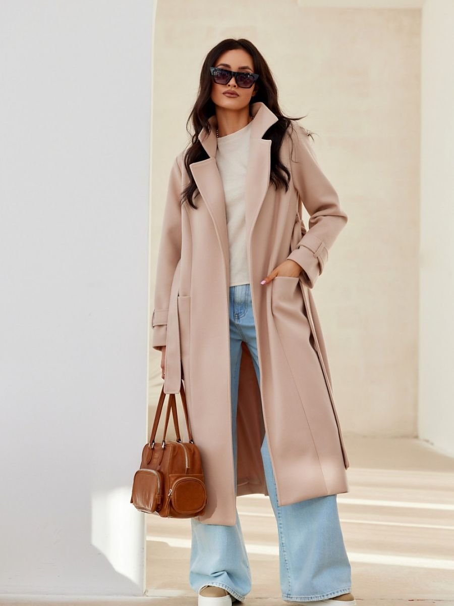 Płaszcz damski z długimi rękawami. Klasyczny kołnierz i prosty dół. Posiada podszewkę, boczne, otwarte kieszenie i jest wiązany w pasie.