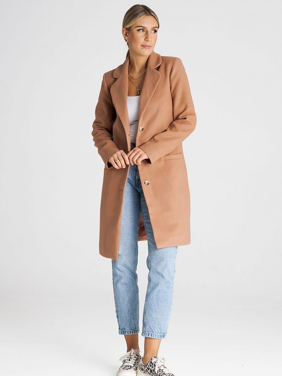 Klasyczny płaszcz z wykładanym kołnierzem, zapinany na guziki. Z przodu proste, wsuwane kieszenie. Płaszcz posiada podszewkę. Długość za kolano.