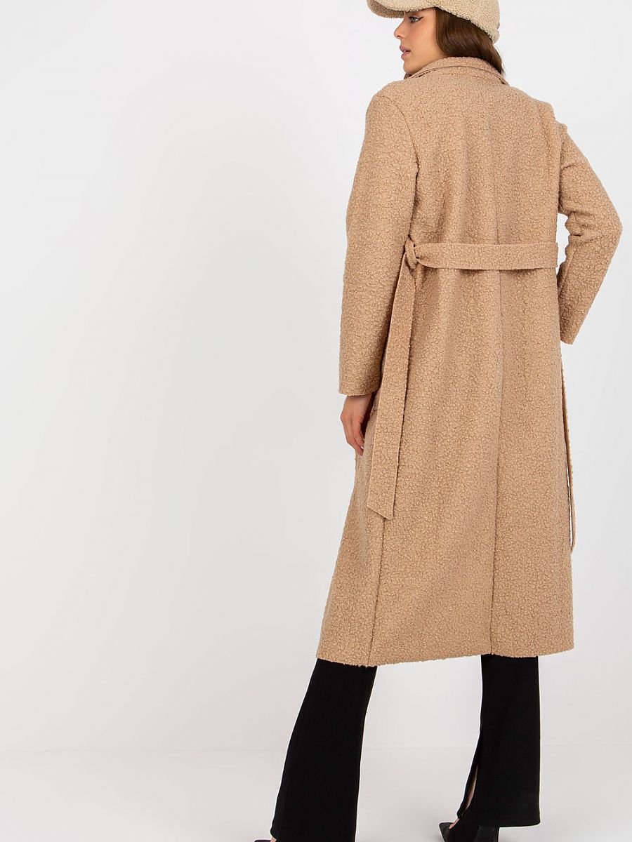 Płaszcz damski z długim rękawem oraz naszytymi kieszeniami wsuwanymi. Płaszcz bez podszewki, zapinany na guzik, z paskiem do wiązania.