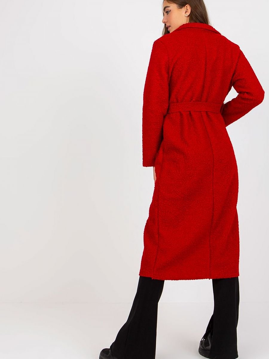 Płaszcz damski z długim rękawem oraz naszytymi kieszeniami wsuwanymi. Płaszcz bez podszewki, zapinany na guzik, z paskiem do wiązania.