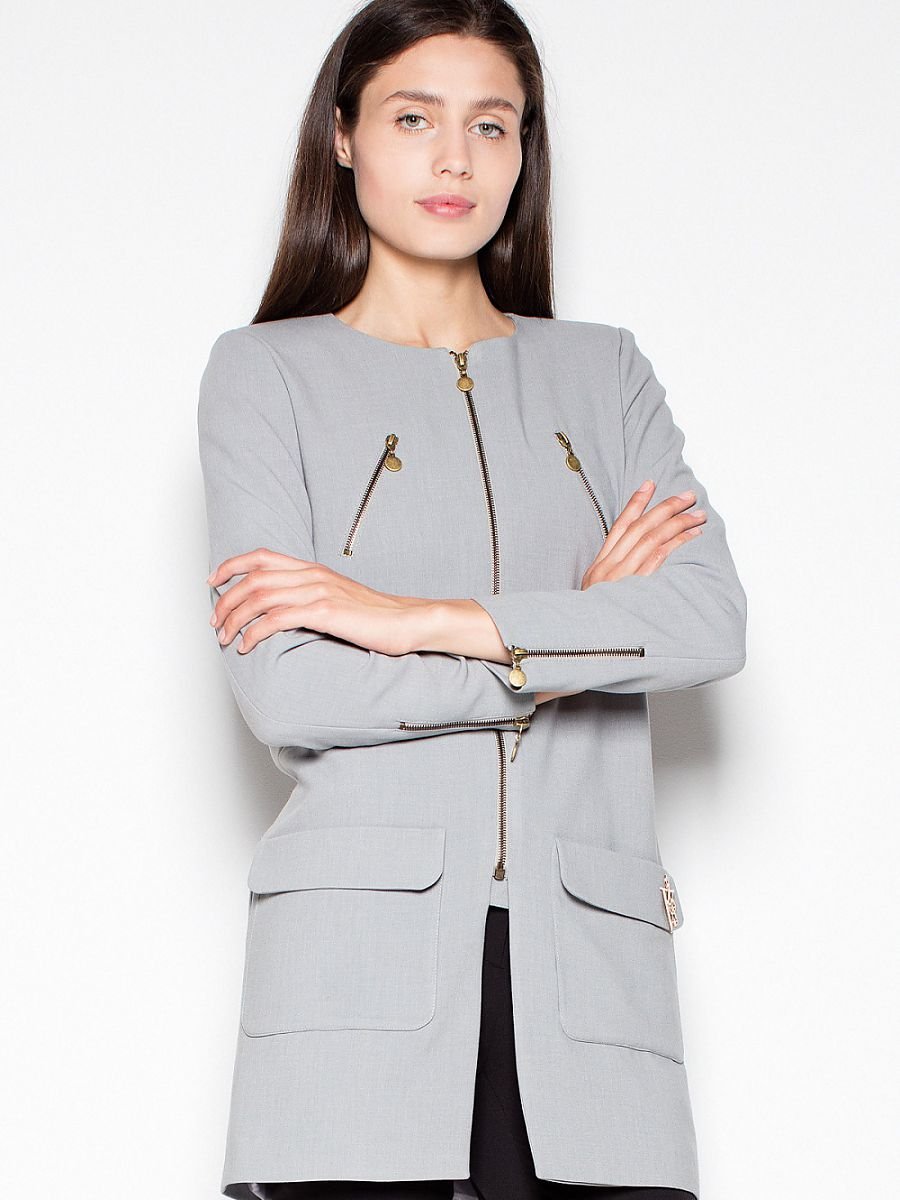 Płaszcz o prostym kroju, zapinany na zamek, wykończony ozdobnymi kieszeniami oraz efektownym rozcięciem przy zamku. Posiada ozdobne suwaki przy mankietach i kołnierzyku. Świetna do codziennych stylizacji.
