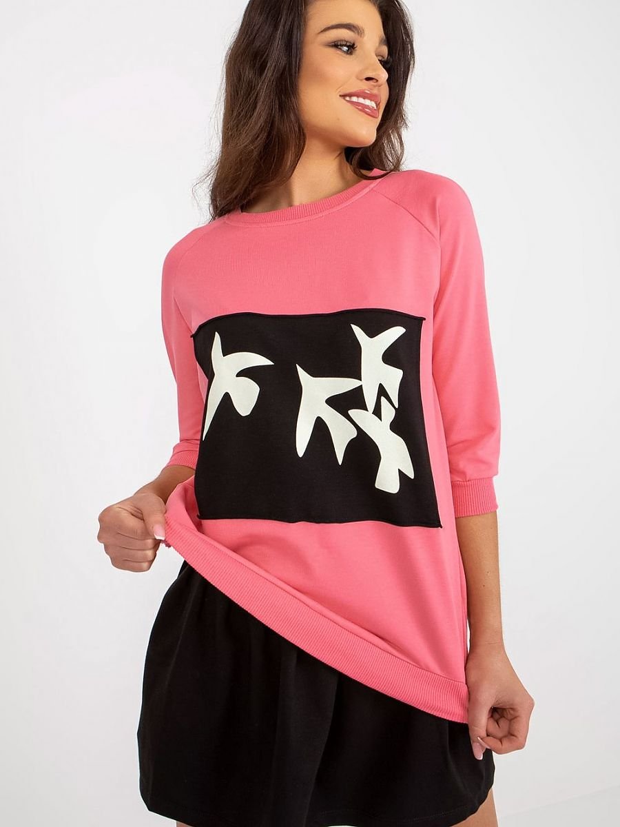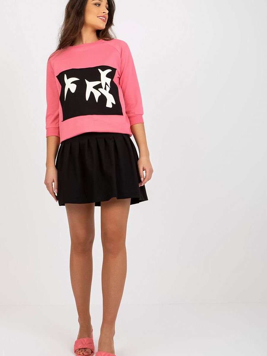 Komplet dresowy składający się z bluzy oraz spódnicy. Bluza z rękawem 3/4 oraz okrągłym dekoltem. Na przodzie ozdobny nadruk. Spódnica o wyższym stanie, zapinana na zamek oraz guzik.