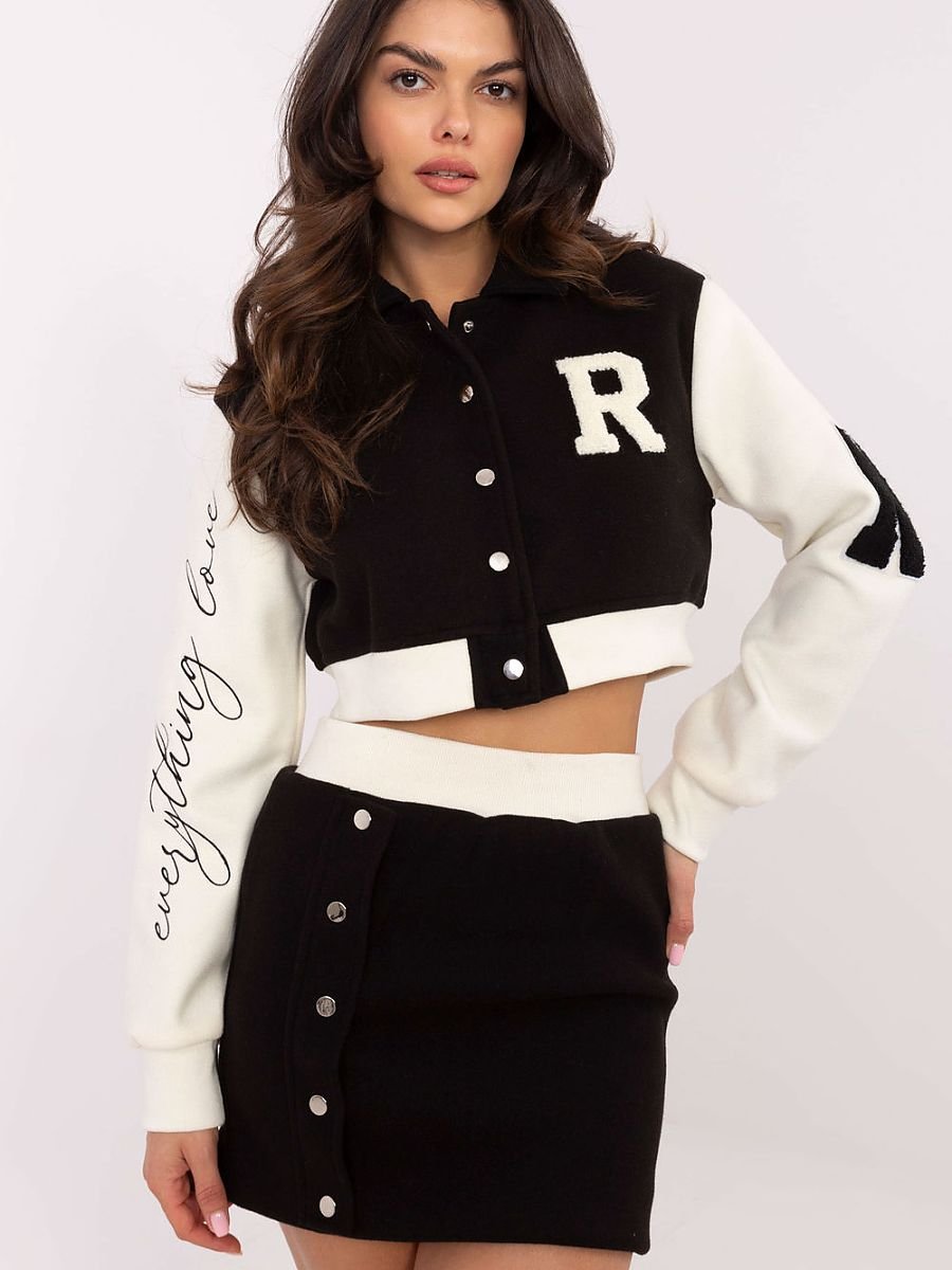 Elegancki i wygodny komplet damski w stylu casual, idealny na codzienne okazje. Wykonany z wytrzymałego poliestru z podszewką, zapewnia komfort noszenia i nowoczesny wygląd. Bluza o krótkiej długości posiada długi rękaw, stójkę oraz praktyczne zapięcie na zatrzaski, które podkreśla jej sportowy charakter. Ozdobne naszywki na rękawie i przodzie oraz haft na drugim rękawie dodają jej oryginalności. Spódnica o krótkiej długości jest wyposażona w szeroką gumę w pasie, co gwarantuje wygodne dopasowanie i podkreślenie talii. Gładki wzór kompletu nadaje mu uniwersalności, idealnie pasując zarówno do minimalistycznych, jak i bardziej wyrazistych stylizacji. To praktyczny i modny zestaw dla kobiet, które chcą łączyć wygodę z wyrazistym designem.
