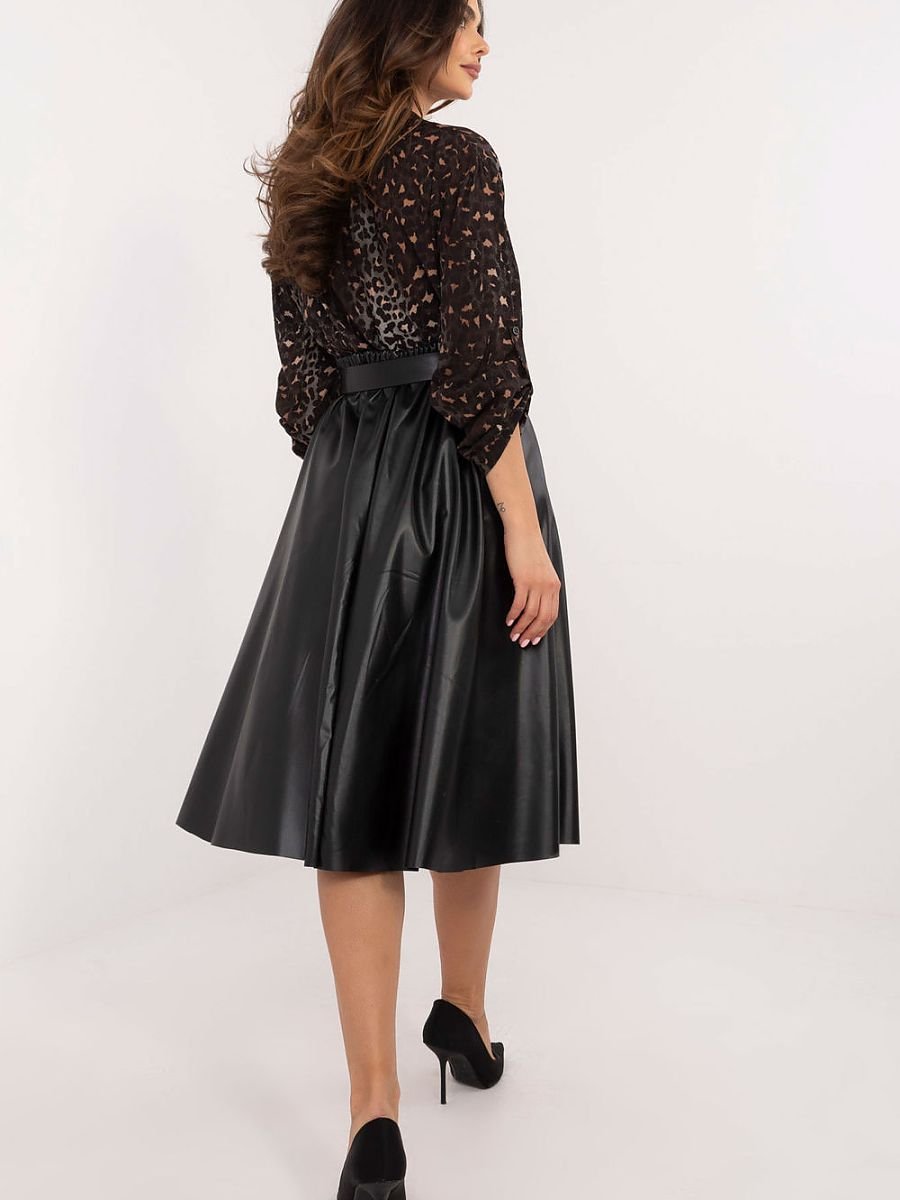 Ta wyjątkowa spódnica to idealne połączenie klasyki i nowoczesności. Rozkloszowany fason pięknie podkreśla sylwetkę, a imitacja skóry dodaje szyku. Gładki materiał i brak zbędnych zdobień sprawiają, że spódnica jest niezwykle uniwersalna. Doskonale sprawdzi się zarówno do pracy, jak i na spotkania z przyjaciółmi. Gumka w pasie zapewnia wygodę noszenia przez cały dzień. Ta spódnica to inwestycja w Twoją garderobę. Jej uniwersalny krój i elegancki materiał sprawią, że poczujesz się pewnie i stylowo w każdej sytuacji.