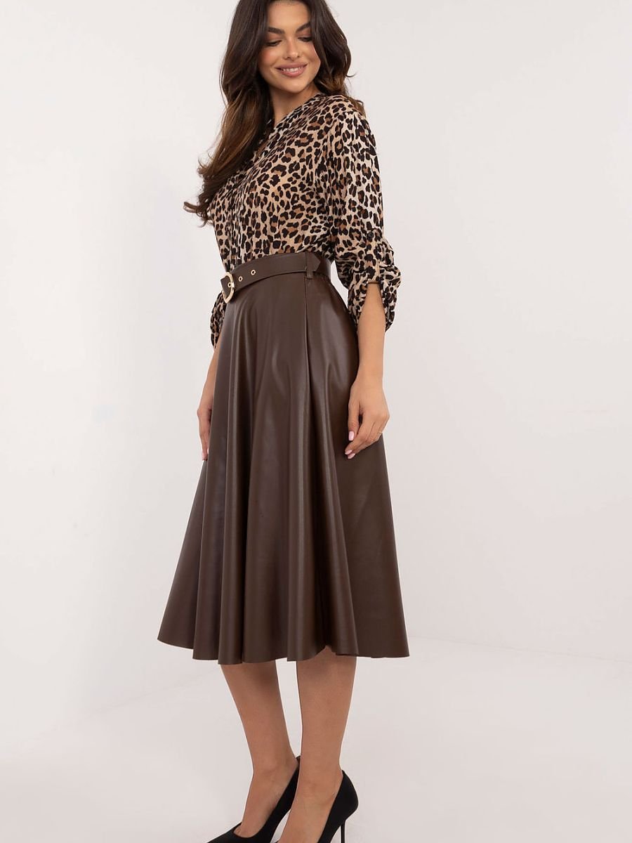 Ta wyjątkowa spódnica to idealne połączenie klasyki i nowoczesności. Rozkloszowany fason pięknie podkreśla sylwetkę, a imitacja skóry dodaje szyku. Gładki materiał i brak zbędnych zdobień sprawiają, że spódnica jest niezwykle uniwersalna. Doskonale sprawdzi się zarówno do pracy, jak i na spotkania z przyjaciółmi. Gumka w pasie zapewnia wygodę noszenia przez cały dzień. Ta spódnica to inwestycja w Twoją garderobę. Jej uniwersalny krój i elegancki materiał sprawią, że poczujesz się pewnie i stylowo w każdej sytuacji.