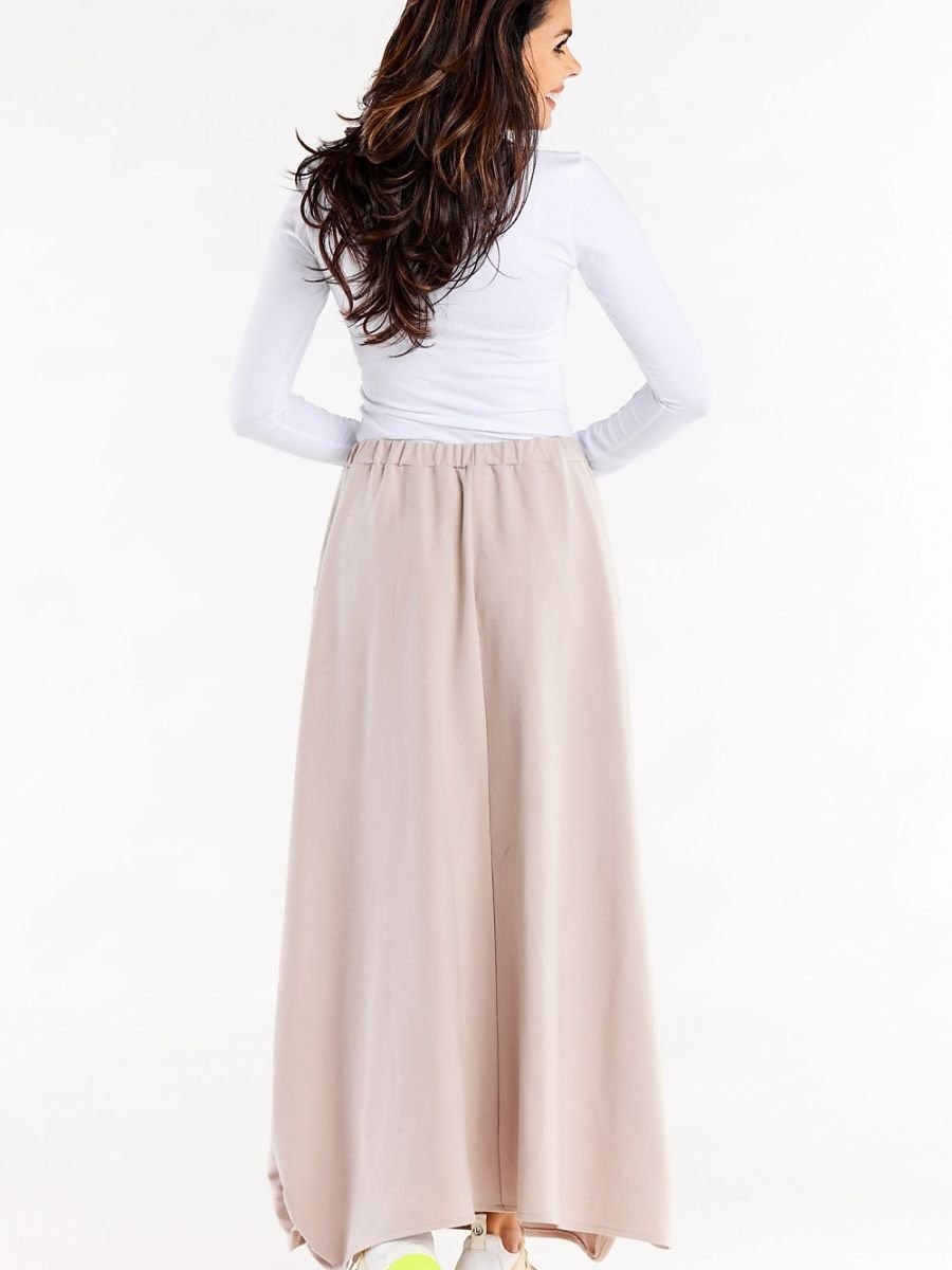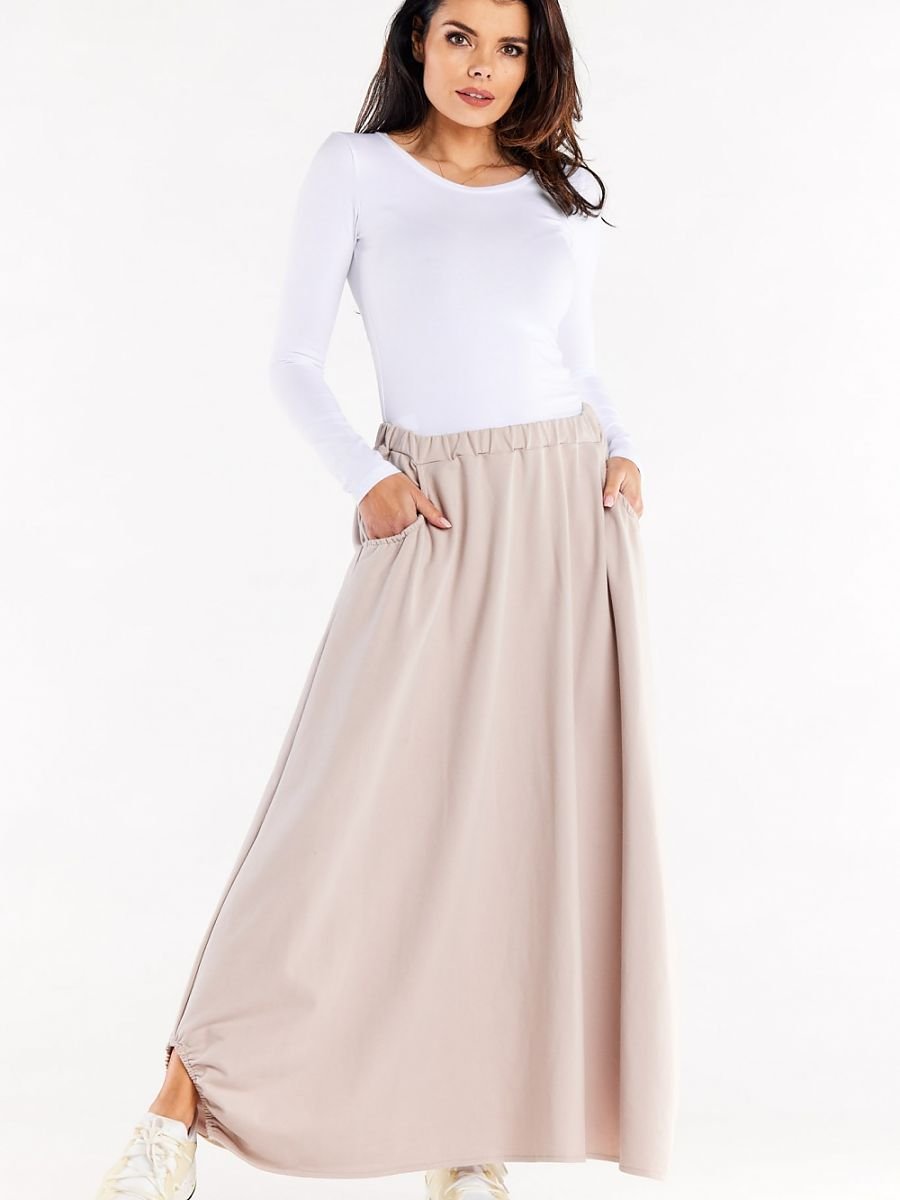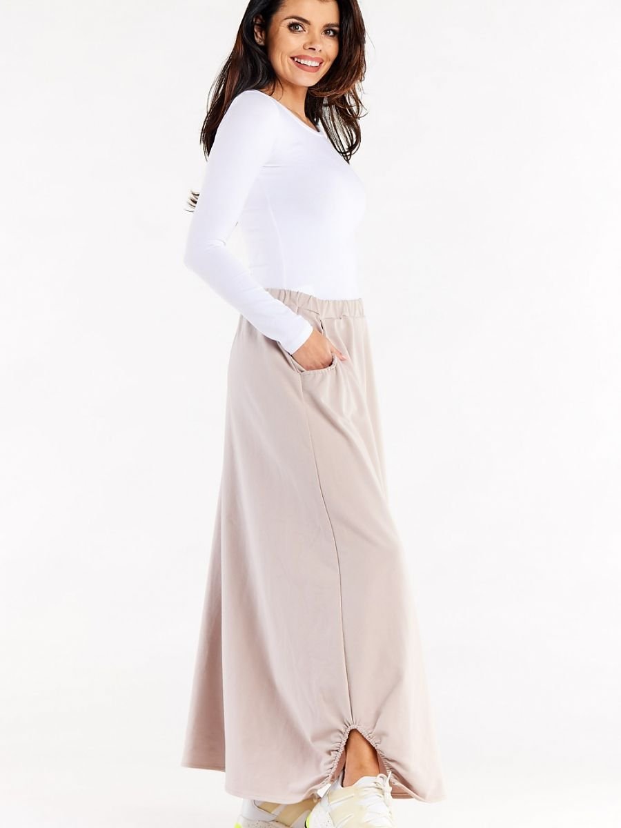 Trapezowa długa spódnica z gumą w pasie. Spódnica z kieszeniami wykończonymi marszczeniem. U dołu ozdobne wycięcia wykończone marszczeniami.