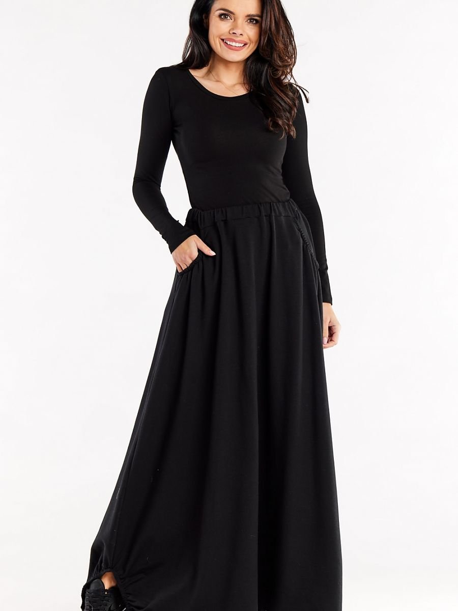 Trapezowa długa spódnica z gumą w pasie. Spódnica z kieszeniami wykończonymi marszczeniem. U dołu ozdobne wycięcia wykończone marszczeniami.