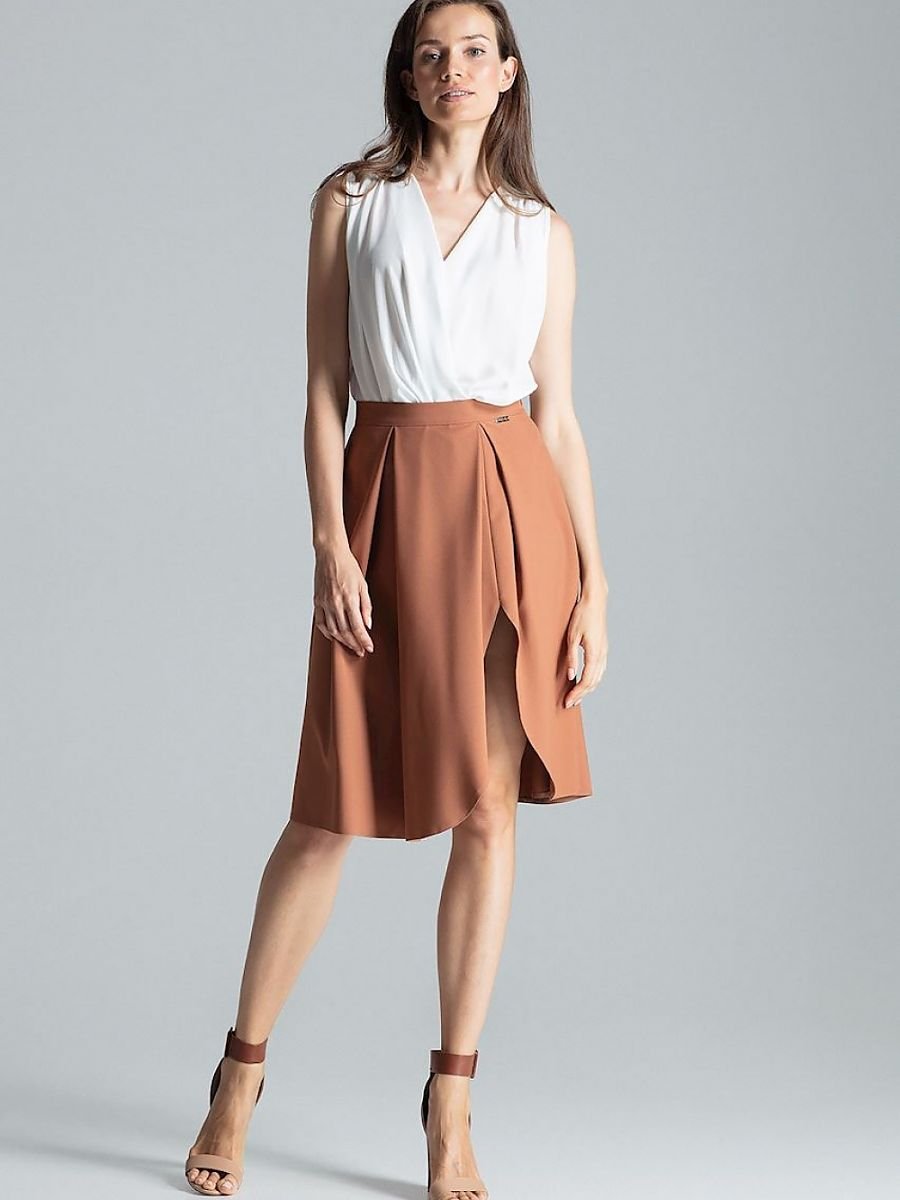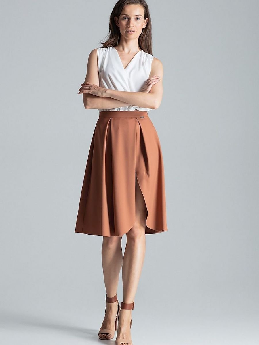 Brązowa spódnica midi w kontrafałdy, bez kieszeni, bez podszewki, typu A, zapinana z boku na suwak. Na lewej nodze, asymetryczne, eleganckie rozcięcie.