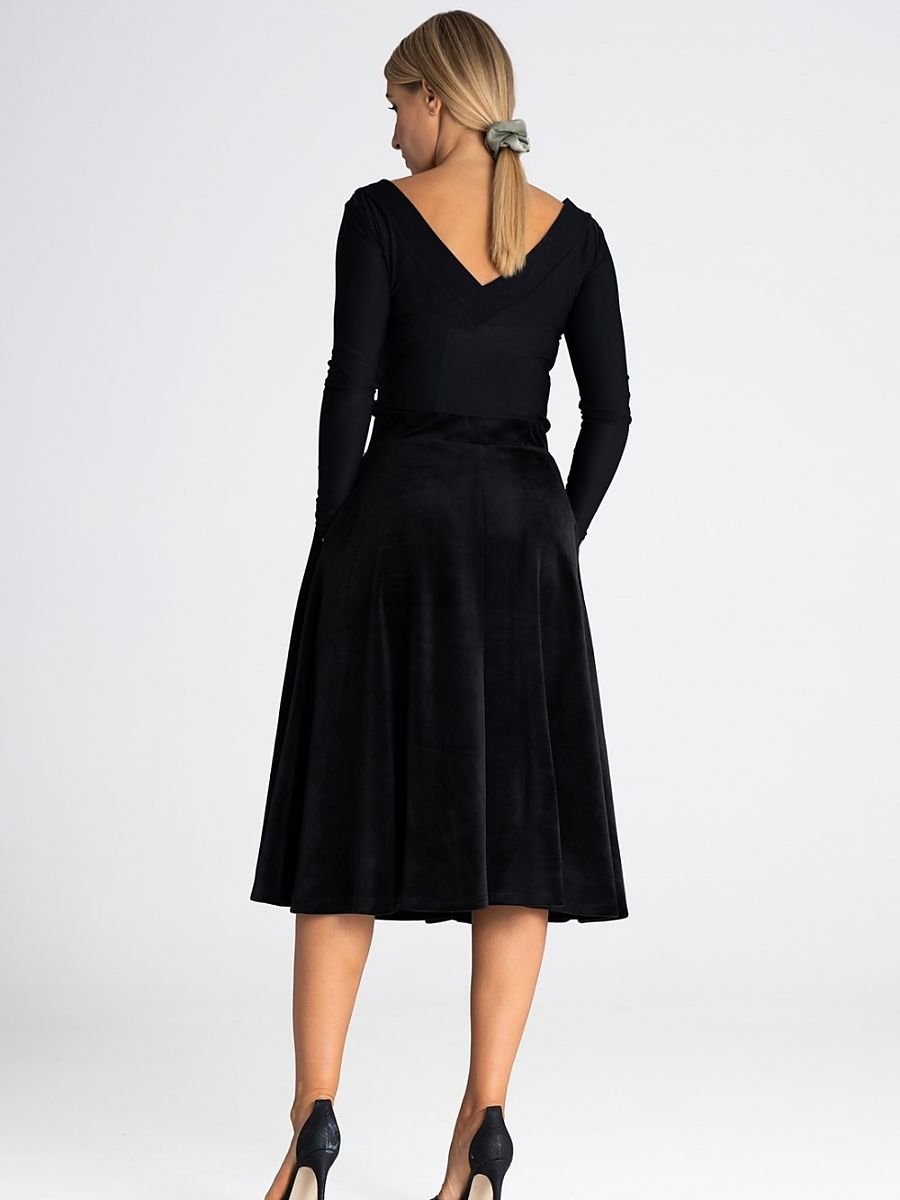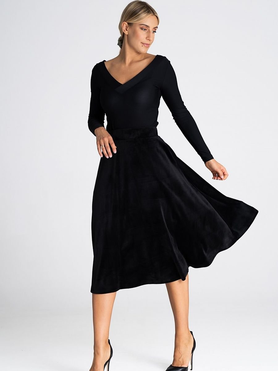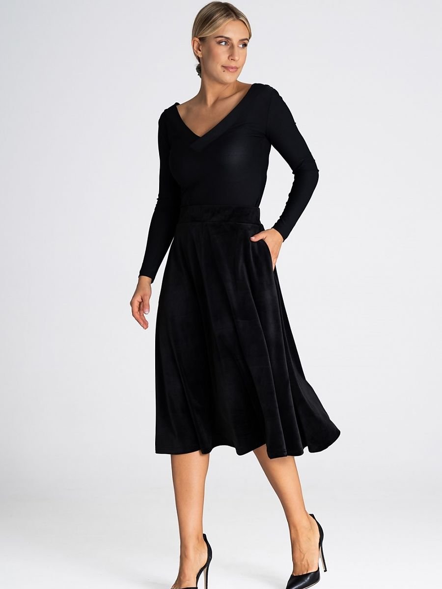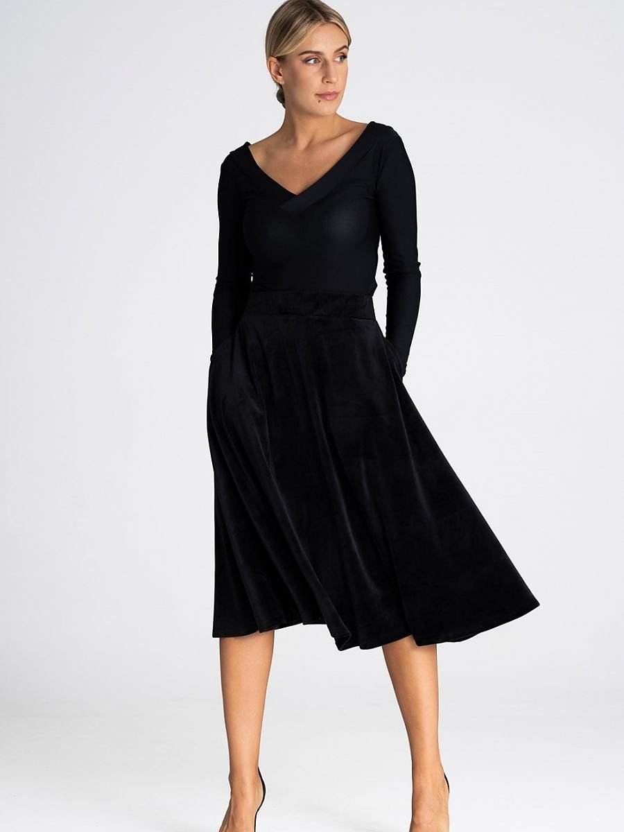 Elegancka midi spódnica podkreślająca wcięcie w talii. Pas elastyczny, a długość spódnicy sięga łydek i jest subtelnie rozkloszowana.