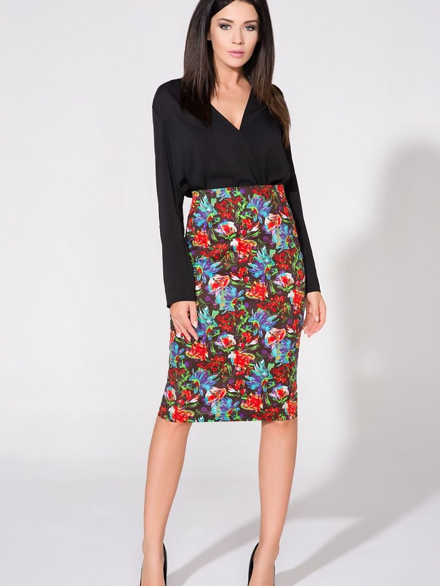 Elegancka spódnica ołówkowa z tkaniny w kwiaty. Z tyłu ozdobny zamek i rozcięcie.