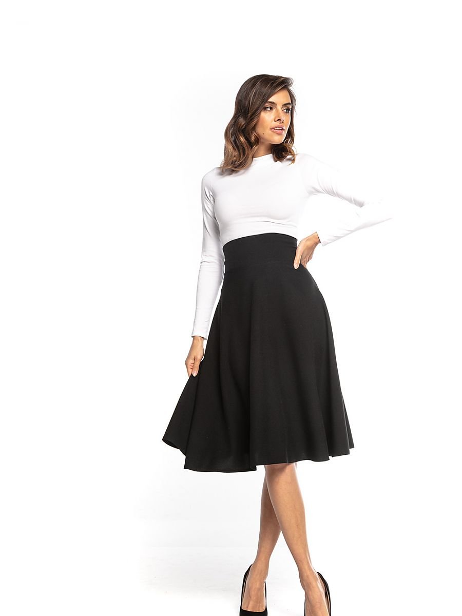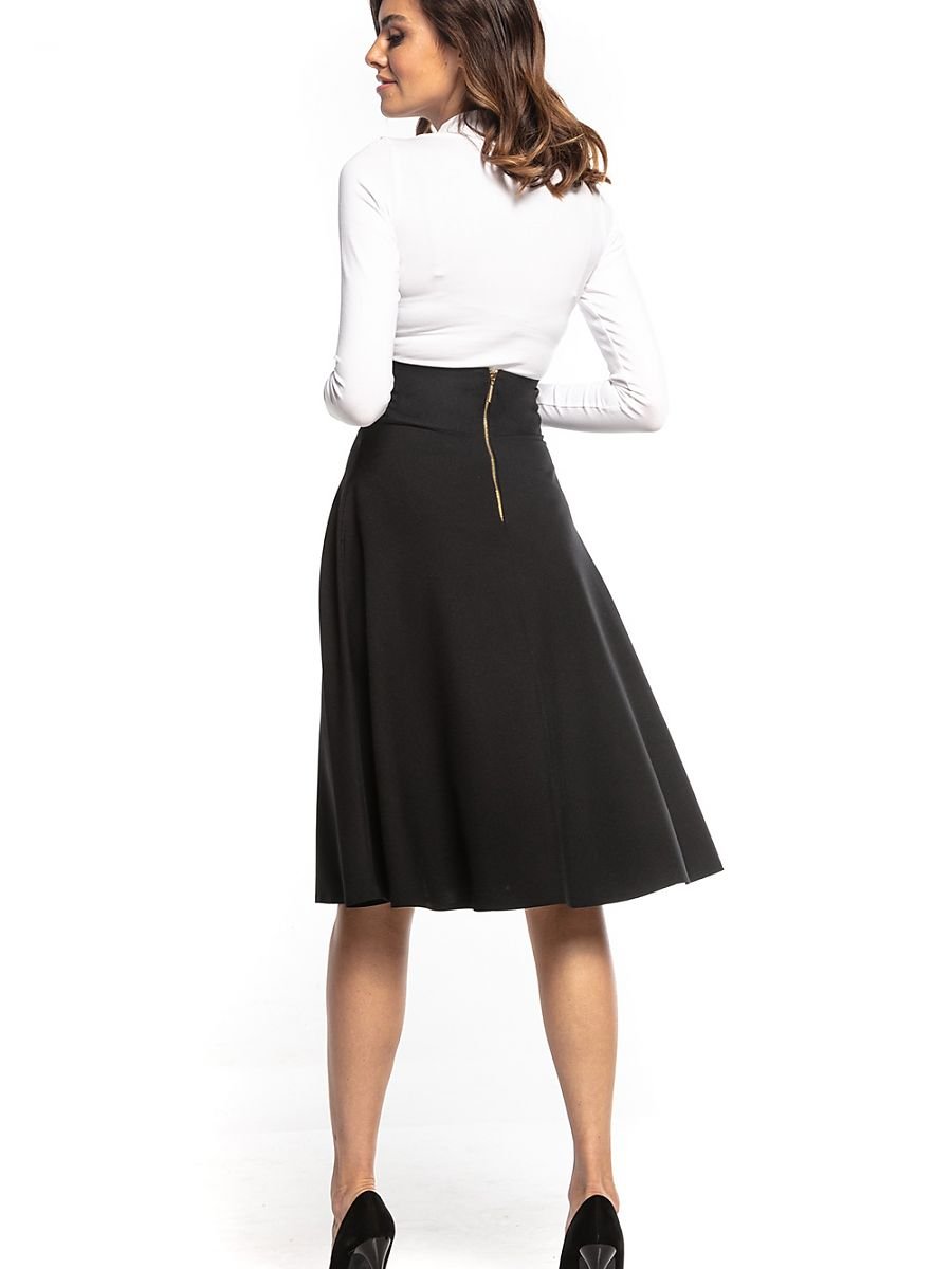 Spódnica midi z wysokim stanem, długość za kolano, zapinana na ozdobny zamek.
